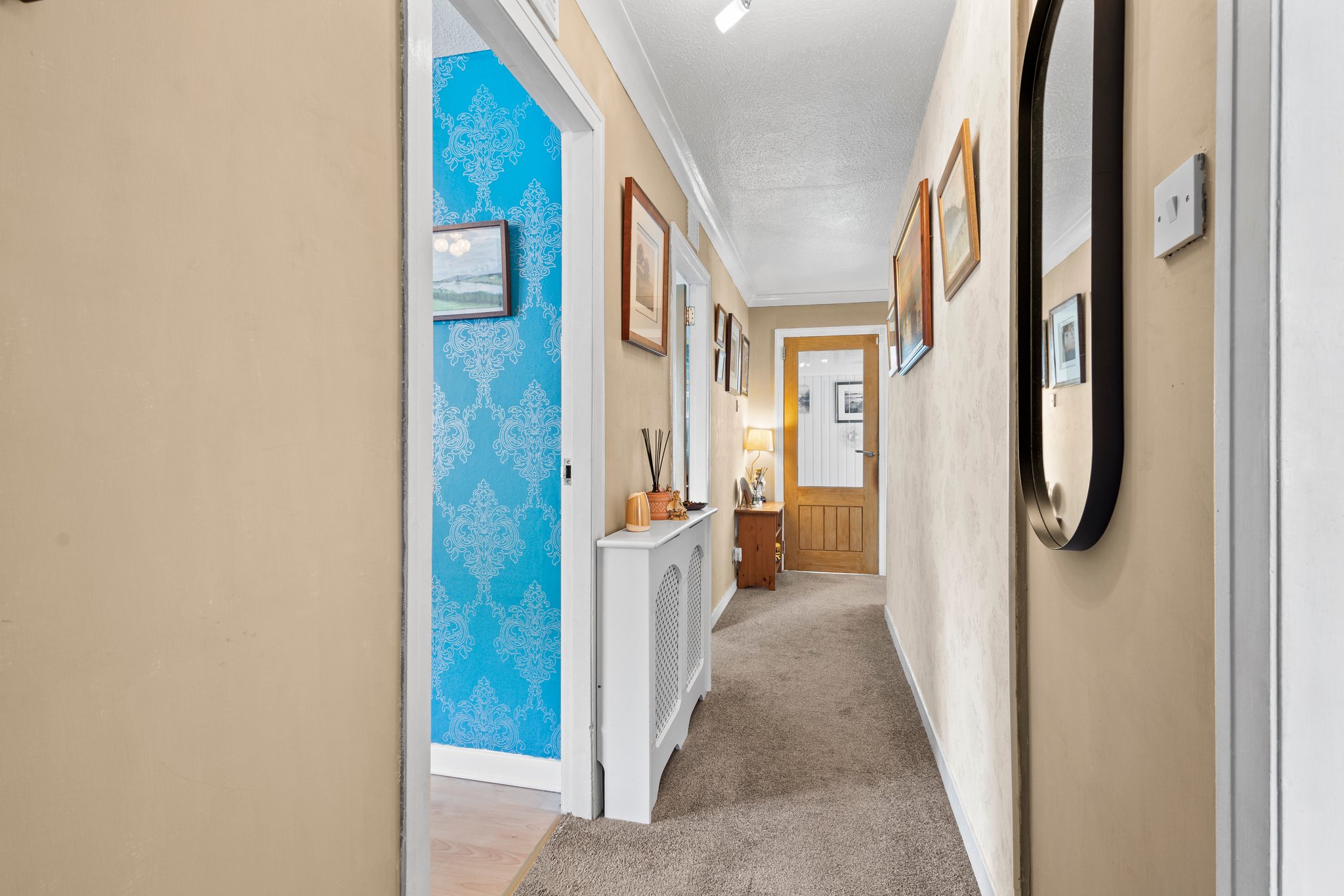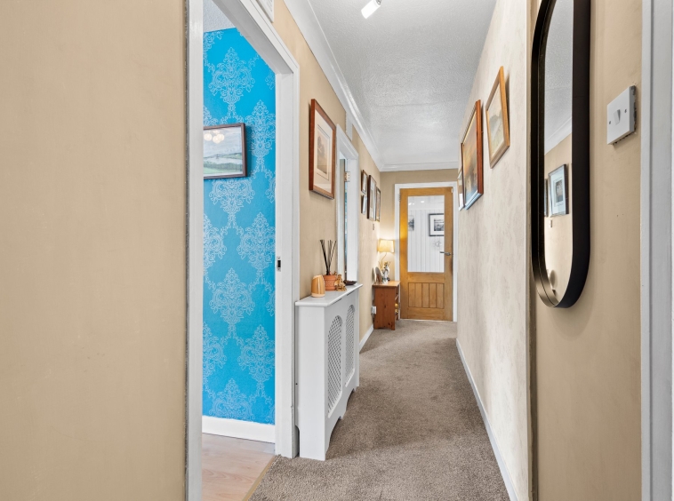 2.07m x 6.06m (6′ 9″ x 19′ 11″) The welcoming hallway provides door access to the lounge, two bedrooms and bathroom, with neutral decor, fitted carpet, ceiling coving, practical storage cupboard and carpeted staircase leading to the upper level.