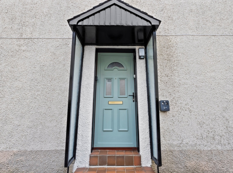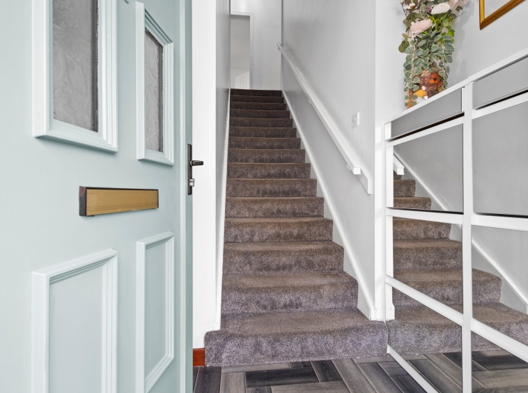 With access via the private entrance stairwell, the hallway offers neutral decor with fitted carpet, practical storage cupboard and door access to the lounge, two bedrooms and bathroom.