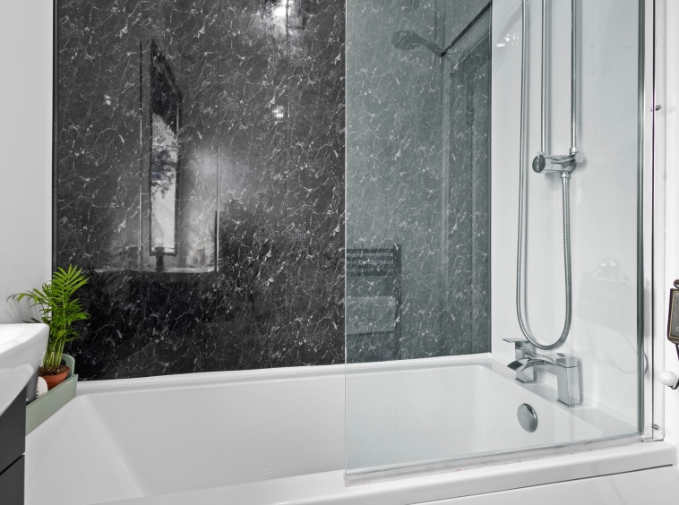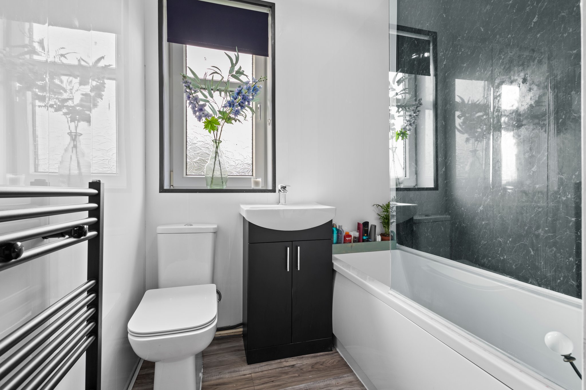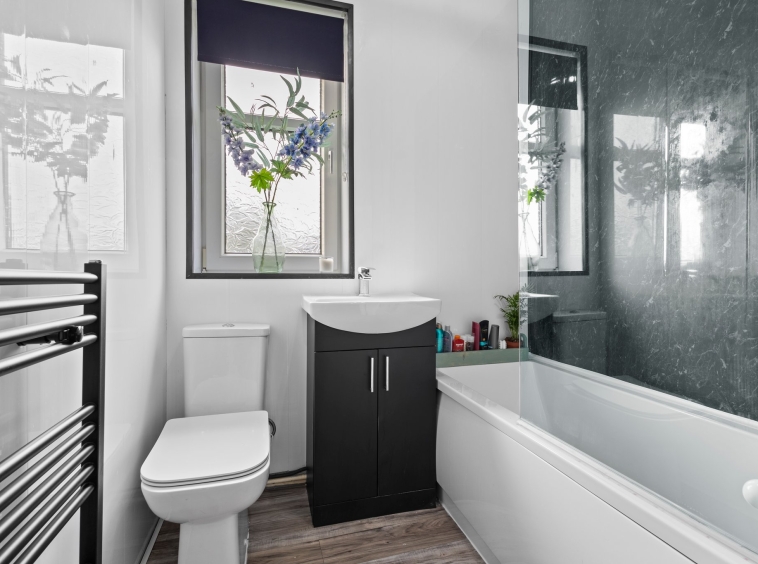 1.87m x 1.65m (6′ 2″ x 5′ 5″) Completing the accommodation is the three piece bathroom suite comprising of a wash hand basin with vanity storage, wc and bath with overhead mains shower. Modern wet wall finish to walls, laminate flooring and double glazed opaque window to the rear.