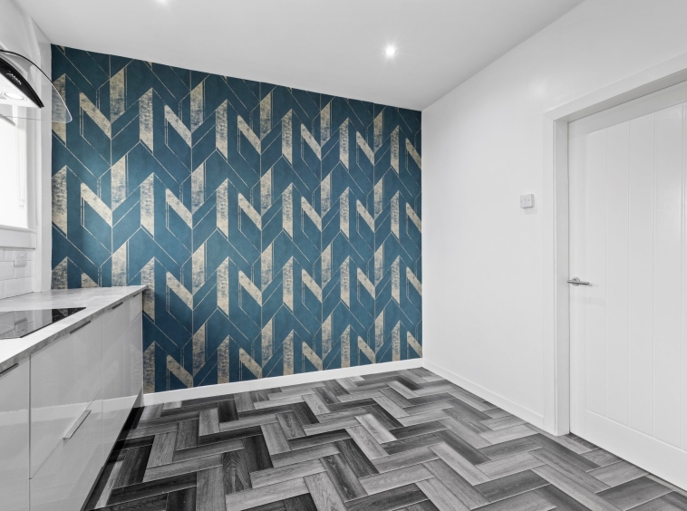 3.96m x 3.05m (13′ 0″ x 10′ 0″) Spacious, contemporary fitted kitchen providing a range of modern high gloss wall and base storage units with complementary work surfaces, composite sink and drainer, integrated appliances including oven, electric hob, washing machine, dishwasher and fridge/freezer. Neutral decor, vinyl flooring, ceiling spotlights and plentiful space for dining table and chairs. Double glazed window to the rear.
