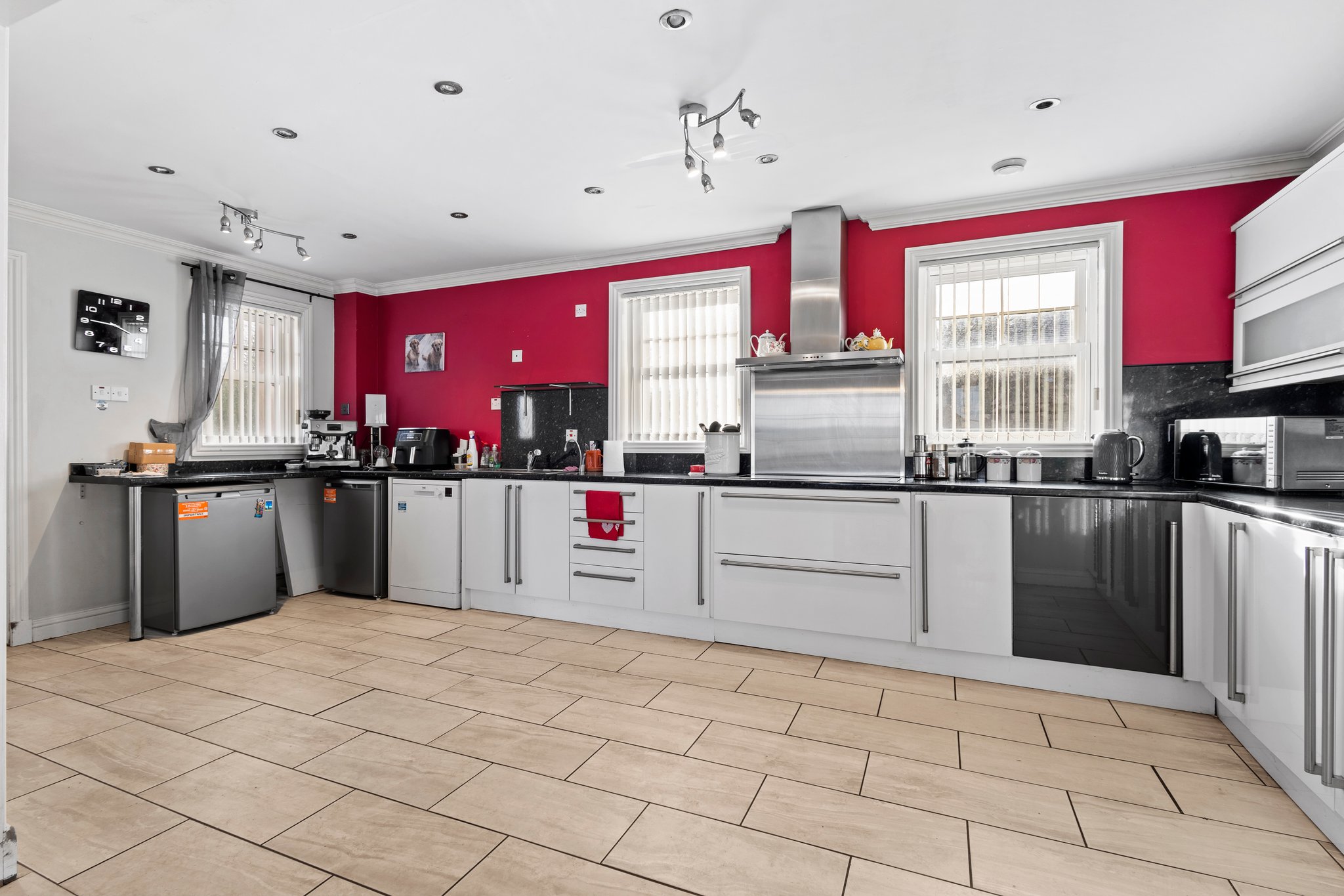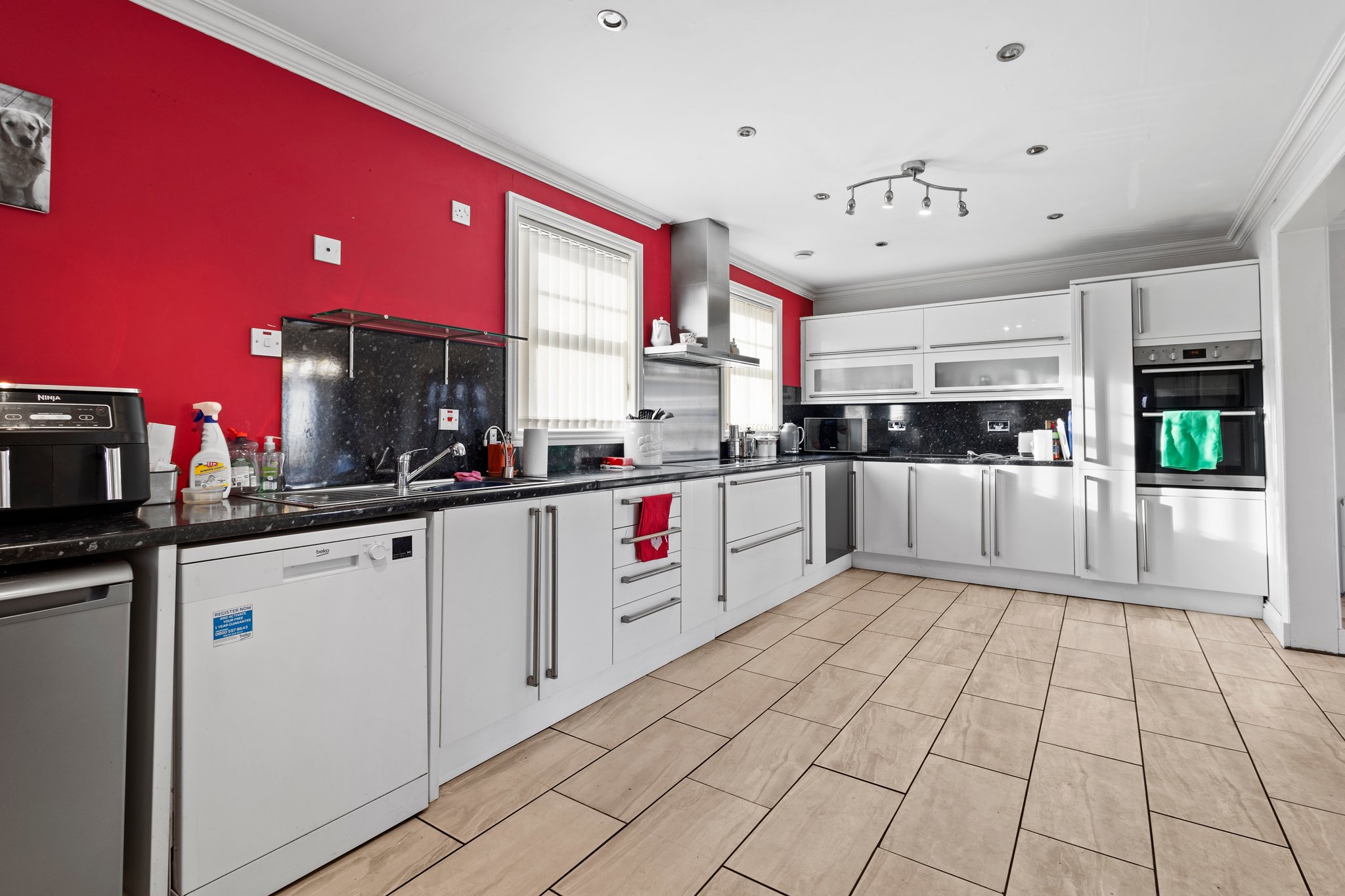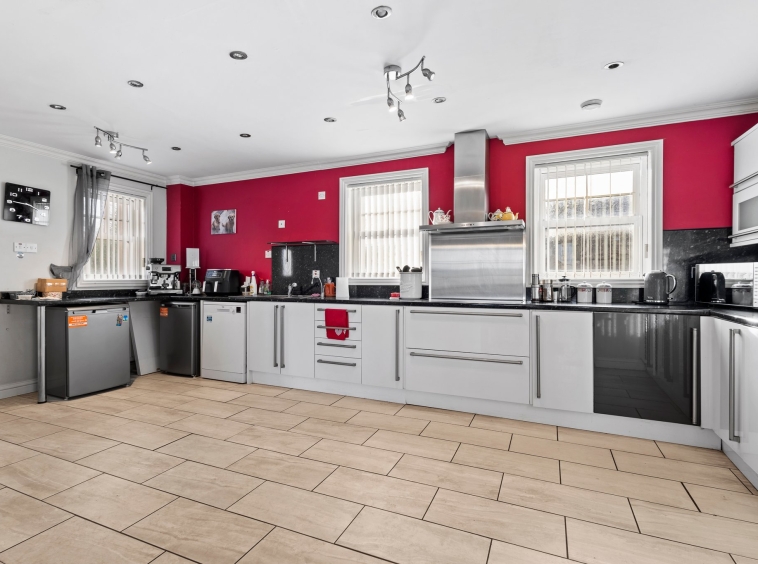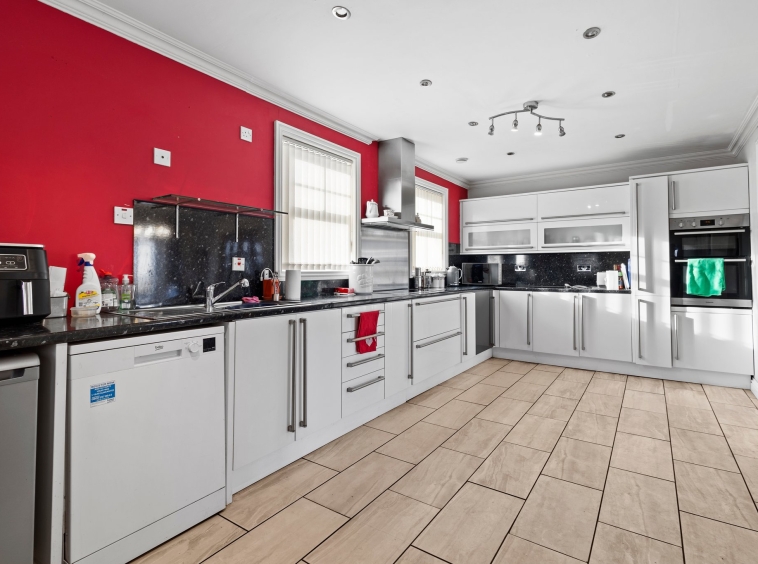 6.20m x 3.12m (20′ 4″ x 10′ 3″) Fully fitted dining sized kitchen complete a modern open plan layout to the dining room, with ample wall and base storage units, integrated oven and electric hob, stainless steel sink and drainer, plumbing and space for a dish washer, washing machine and fridge freezer, neutral decor, ceiling spotlights, tiled flooring and double glazed windows to the front.