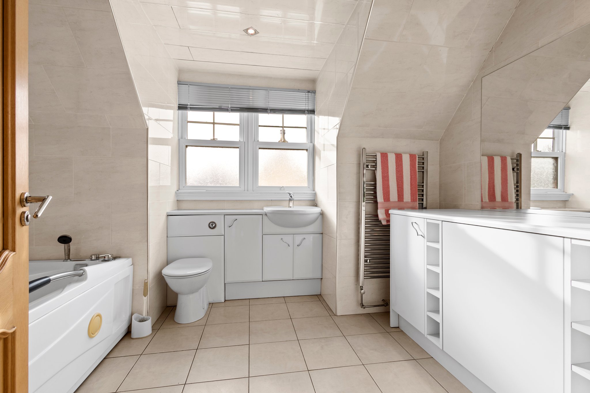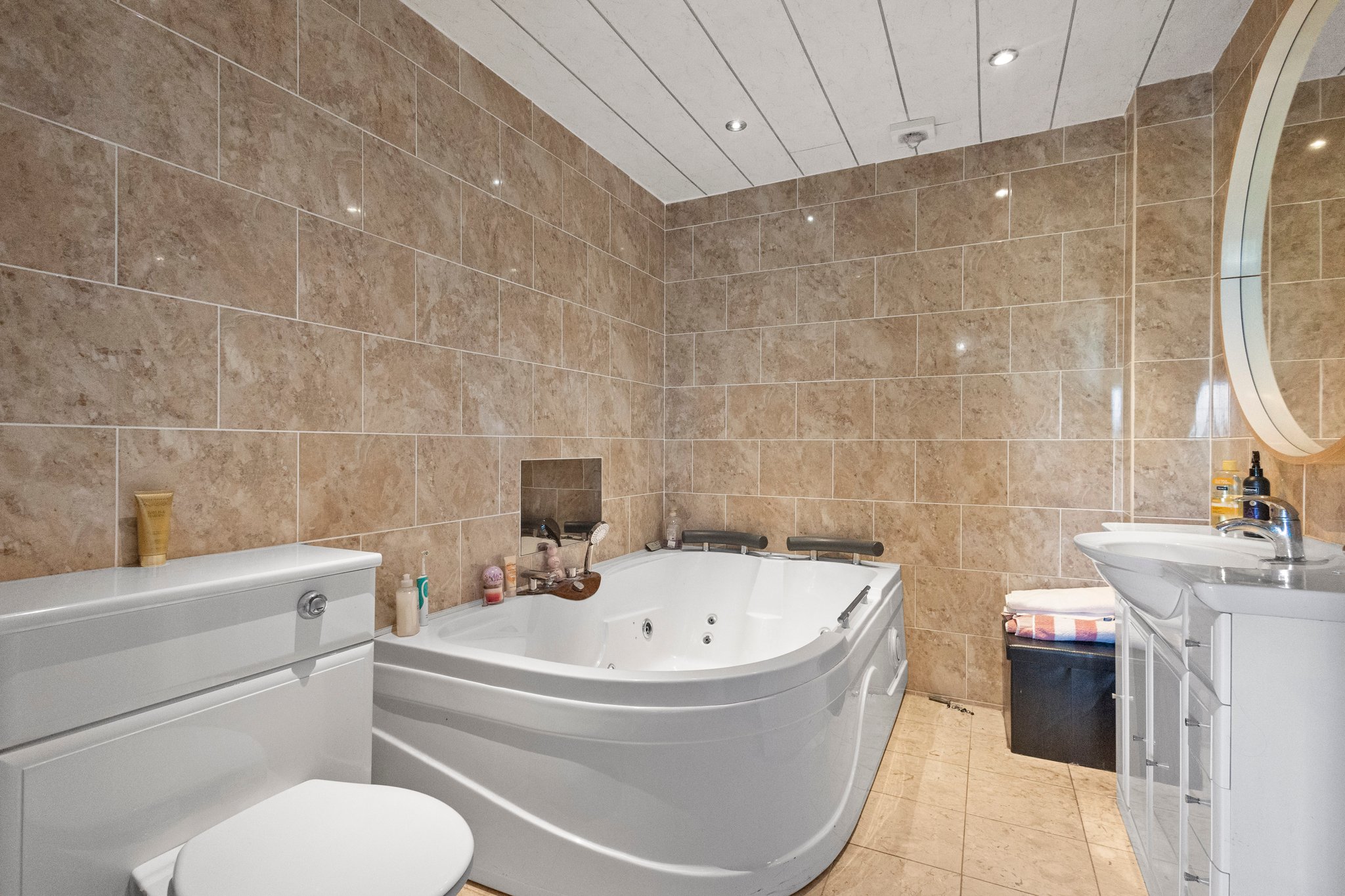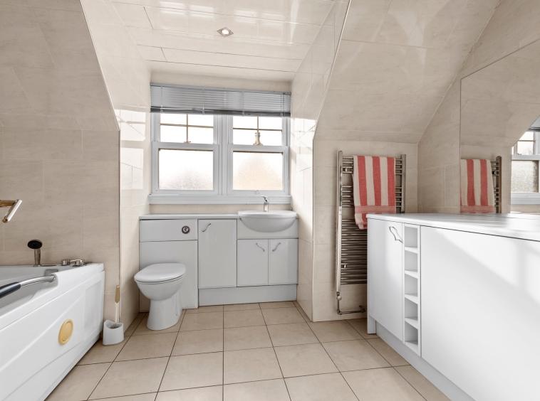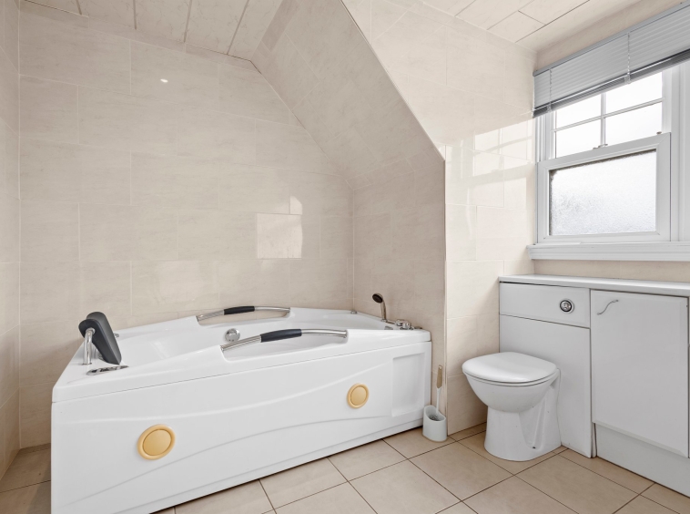 3.43m x 2.70m (11′ 3″ x 8′ 10″) Completing the accommodation is the family bathroom comprising of a wash hand basin, wc, jacuzzi style bath, stylish tiling, heated towel rail, ceiling spotlights and tiled flooring.