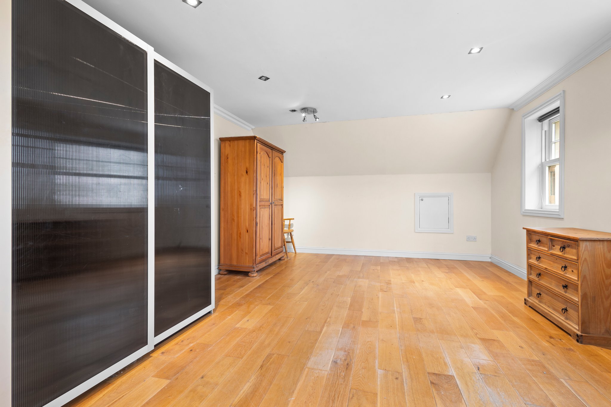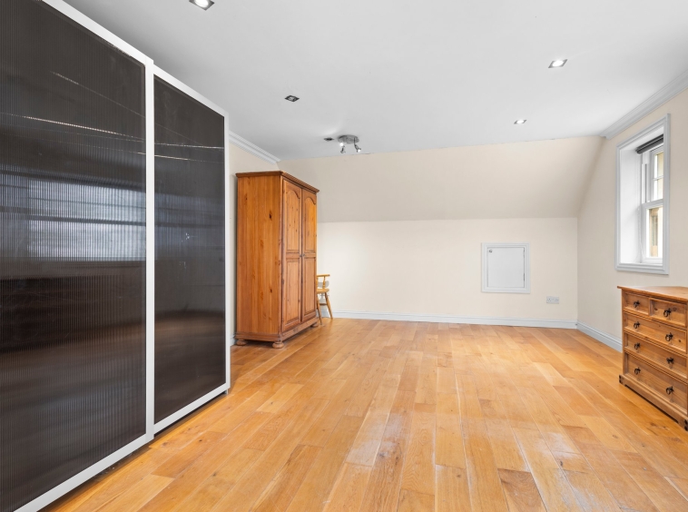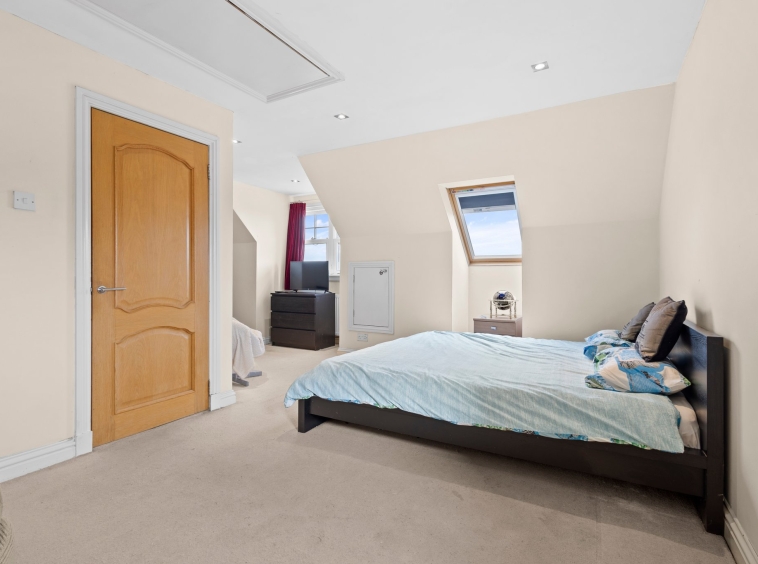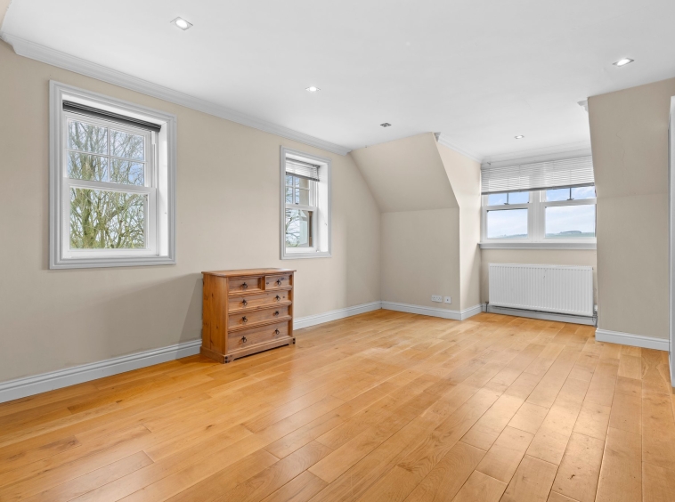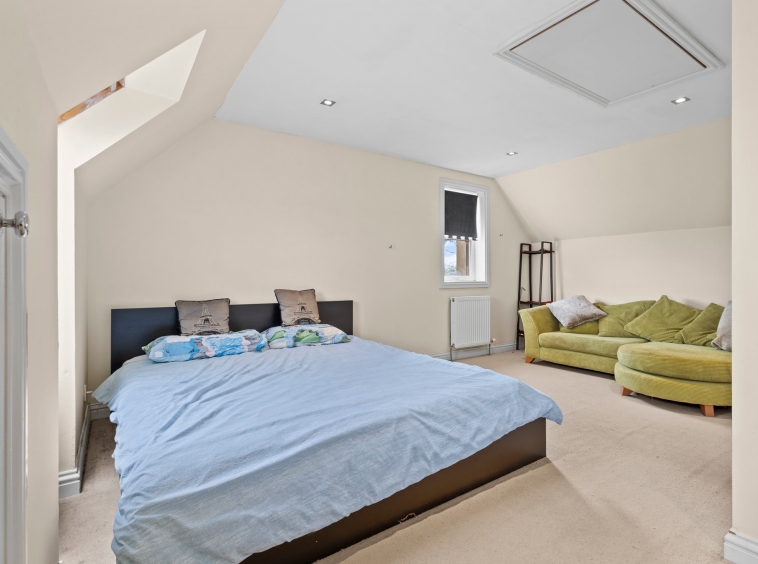 6.20m x 5.56m (20′ 4″ x 18′ 3″) A spacious double bedroom with neutral decor, cornicing, access to eaves storage, hardwood flooring and a double glazed window to the side and rear.