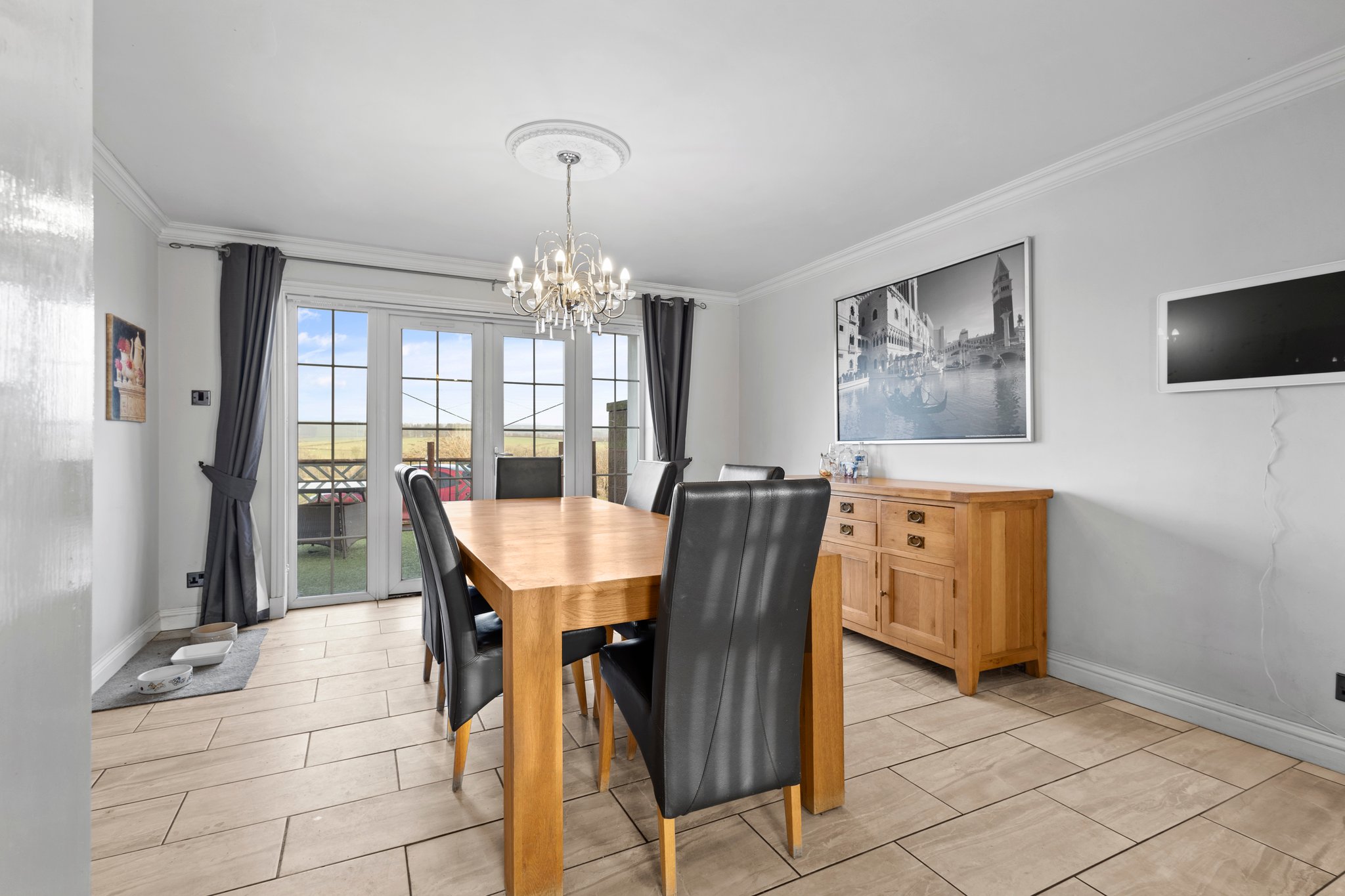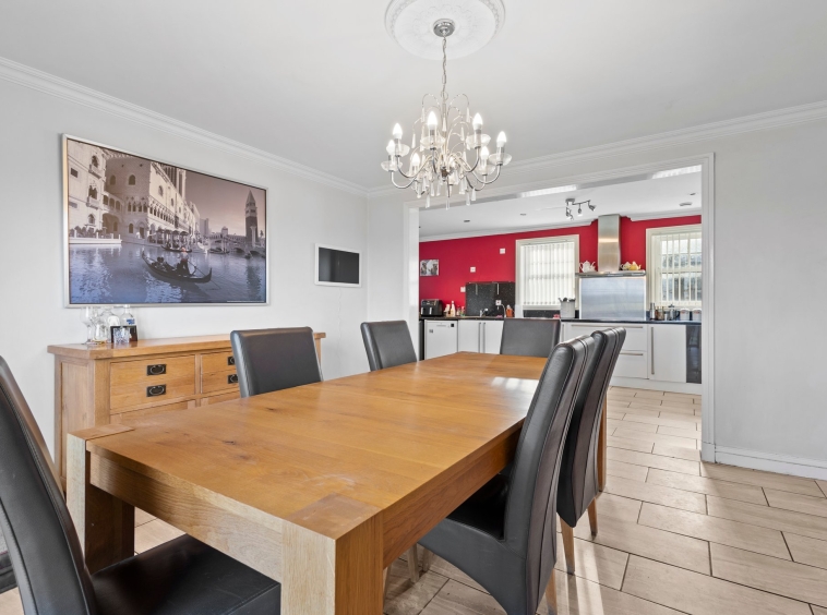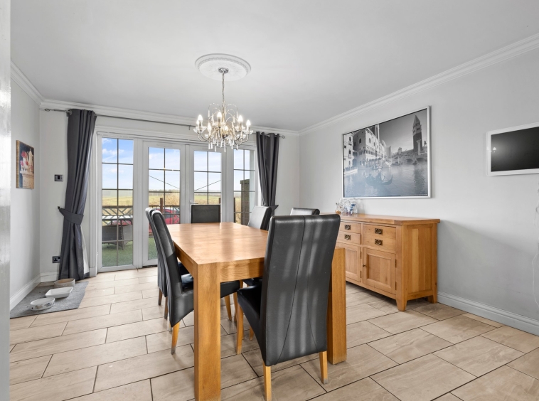 4.13m x 3.96m (13′ 7″ x 13′ 0″) Spacious dining room boasting a contemporary open plan layout to the kitchen, modern decor, tiled flooring and double glazed French doors.