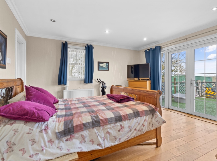 4.03m x 4.06m (13′ 3″ x 13′ 4″) The master bedroom is an impressive double boasting modern decor decor, practical storage cupboard, hardwood flooring, double glazed window to the side, double glazed French doors to the rear and access to en-suite facilities.