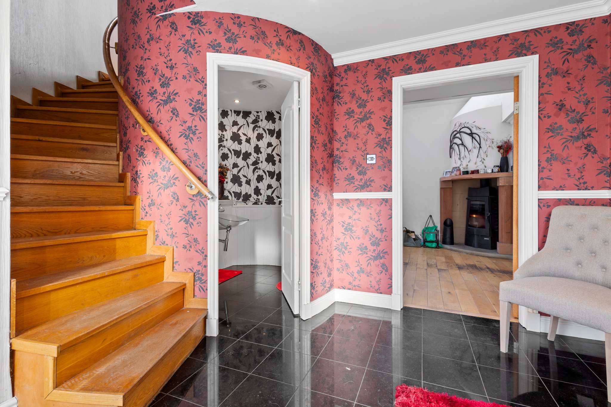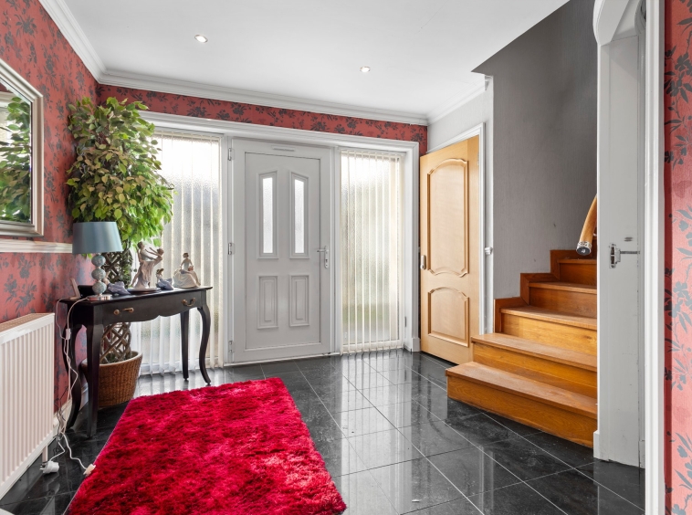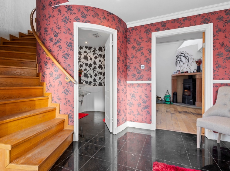 3.43m x 3.12m (11′ 3″ x 10′ 3″) Access is given to a welcoming spacious hallway boasting modern decor, practical storage cupboard, ceiling cornicing and tiled flooring. The hallway gives access to the lounge, wc, bedroom four and a carpeted staircase leads to the upper level.