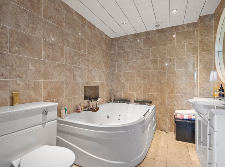 2.22m x 3.02m (7′ 3″ x 9′ 11″) Stylish en-suite comprising of a wash hand basin, wc, jacuzzi bath, heated towel rail, ceiling spotlights, tiling to walls and flooring and a double glazed window to the side.