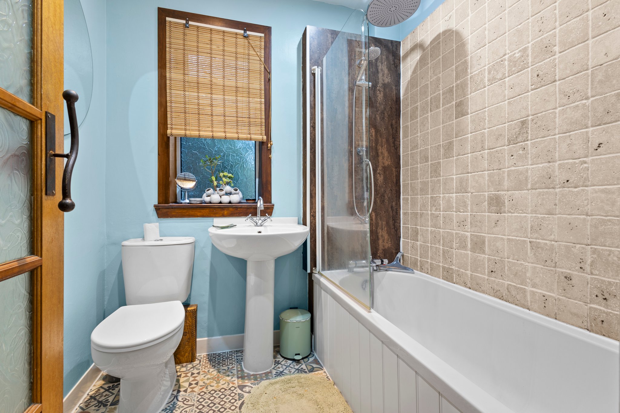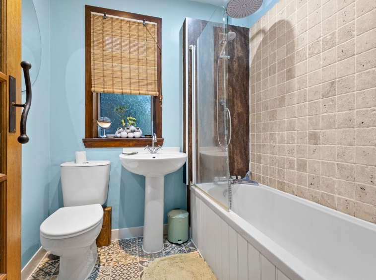 1.89m x 1.84m (6′ 2″ x 6′ 0″) Positioned on the ground floor is the three piece family bathroom comprising of a wash hand basin, wc and bath with overhead mains shower. Soft decor, a range of tile and wet wall finish to walls, stylish vinyl flooring, ceiling spotlights and a double glazed opaque window to the rear.