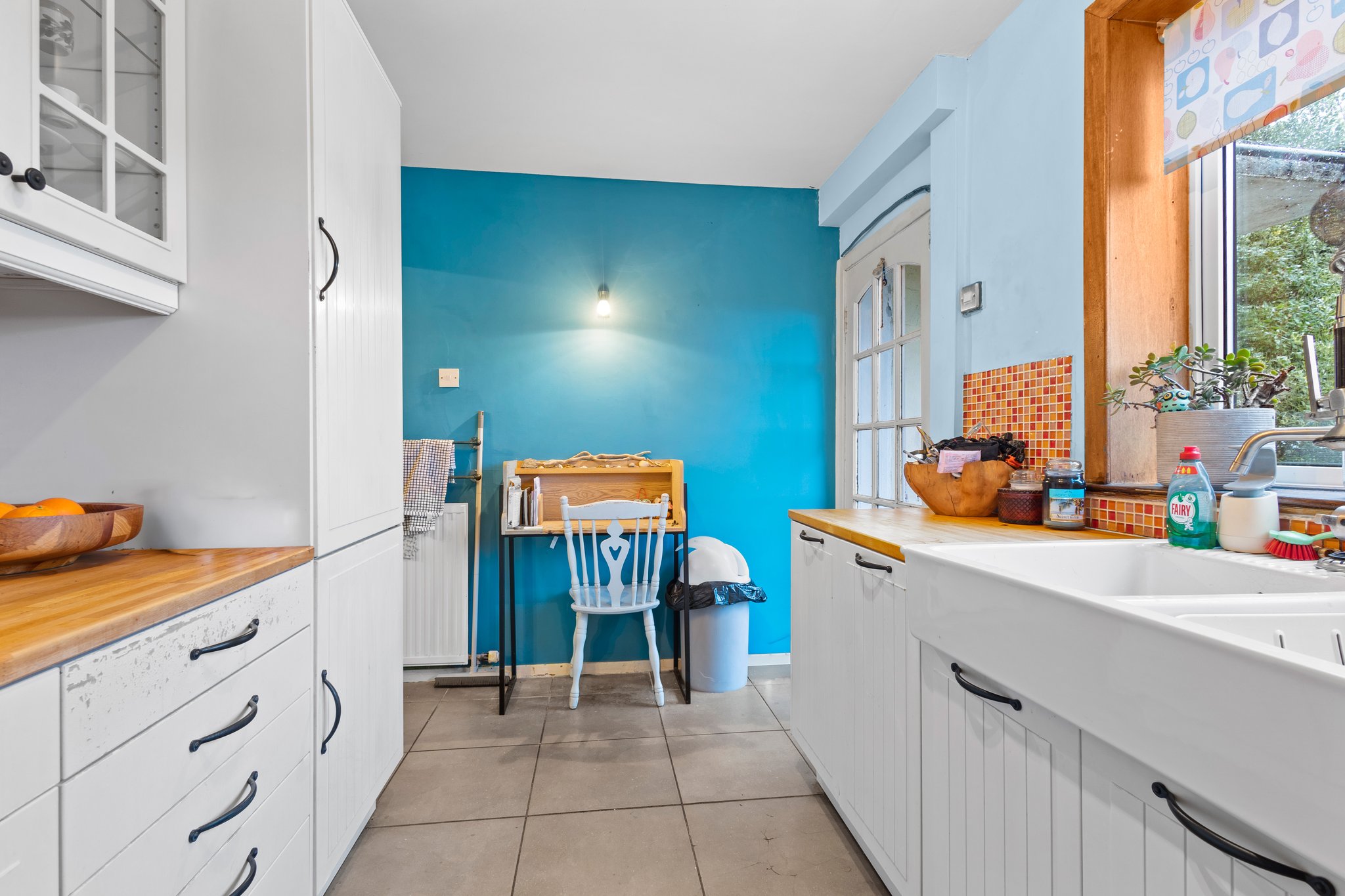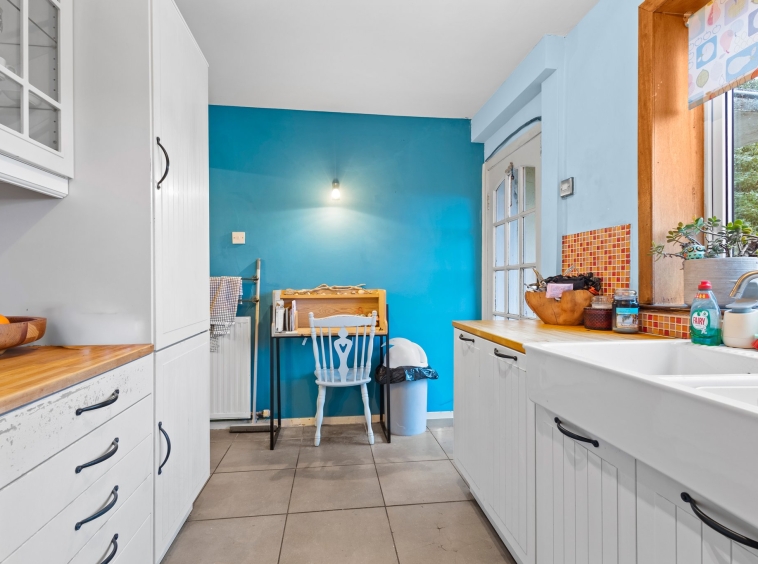 3.87m x 2.39m (12′ 8″ x 7′ 10″) The contemporary fully fitted kitchen offers a wide range of modern white wall and base storage units with complimentary work surfaces, porcelain Belfast sink unit, integrated appliances including oven, gas hob and fridge/freezer. Contemporary decor, tiled flooring, double glazed window to the rear and door leading out into the rear gardens.
