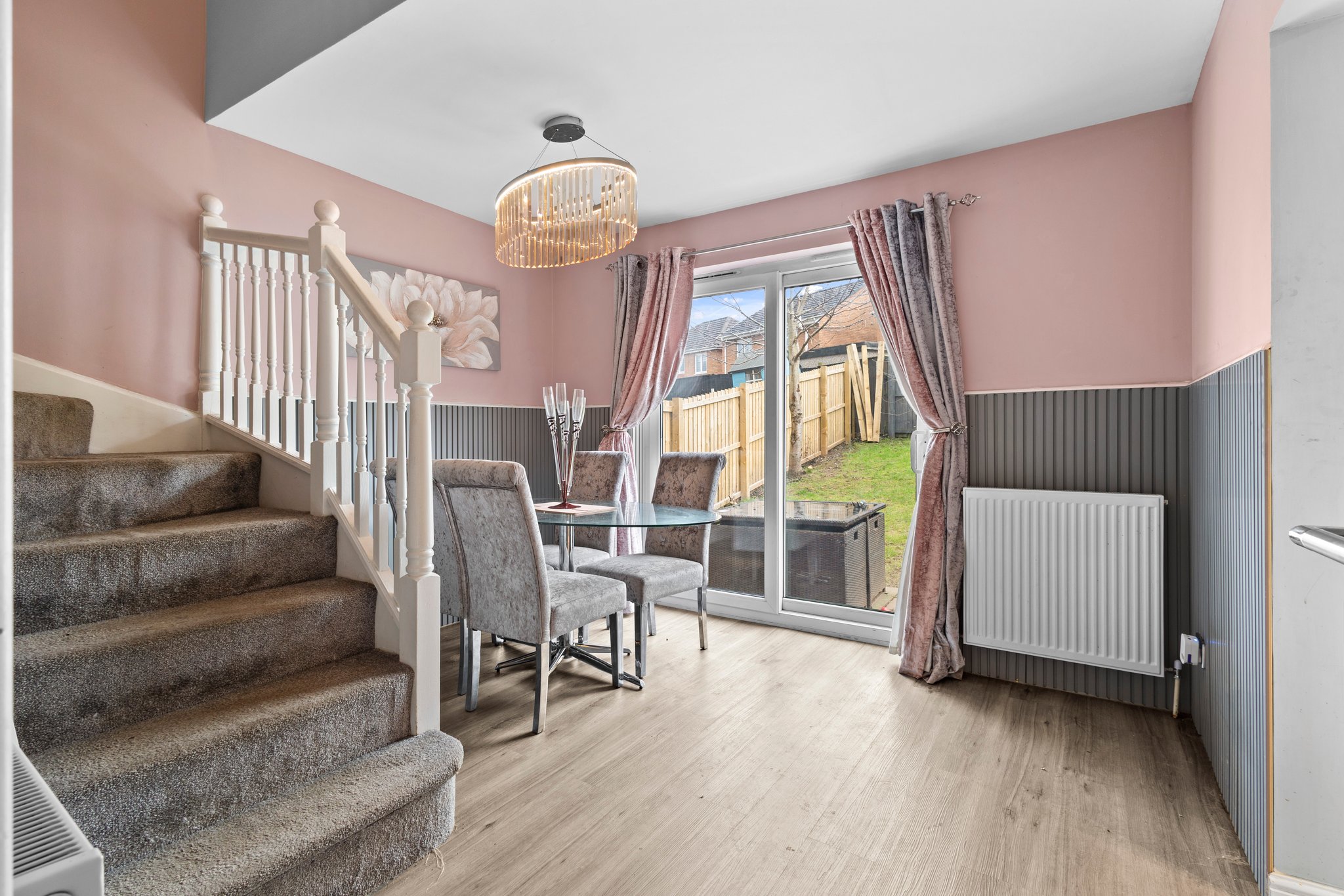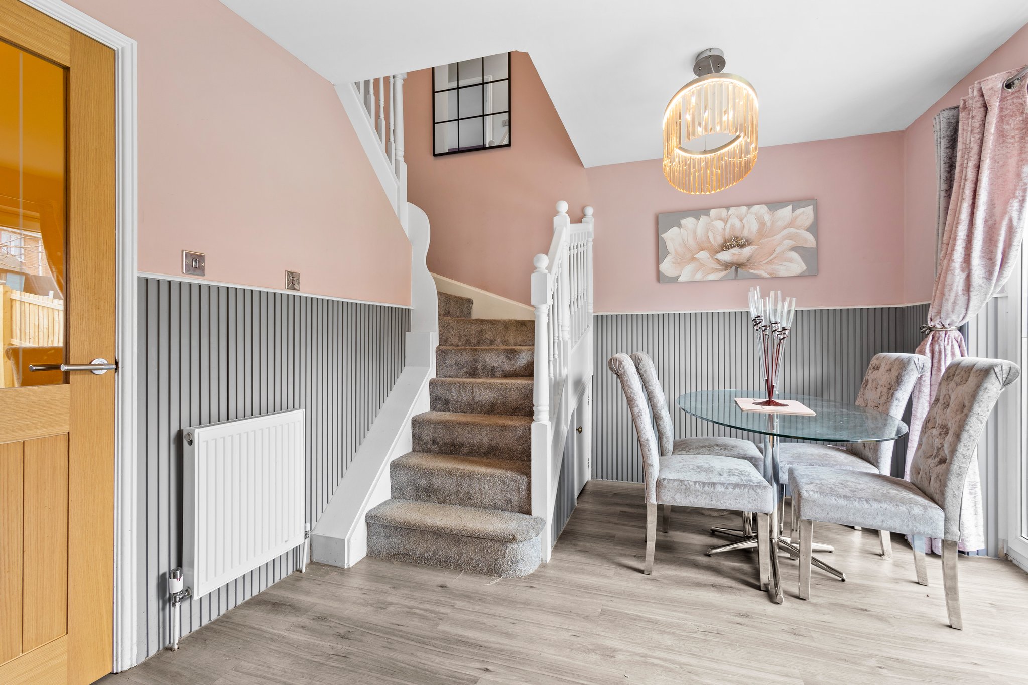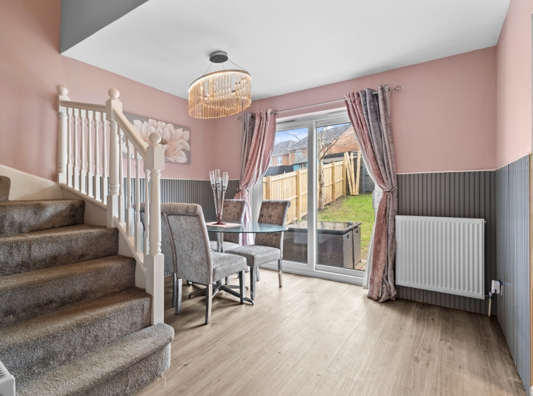 3.45m x 2.95m (11′ 4″ x 9′ 8″) The generous dining room is complete with stylish decor, laminate flooring and double glazed patio doors leading out into the rear gardens. Carpeted staircase leading to the upper level, door to lounge and open access to kitchen.