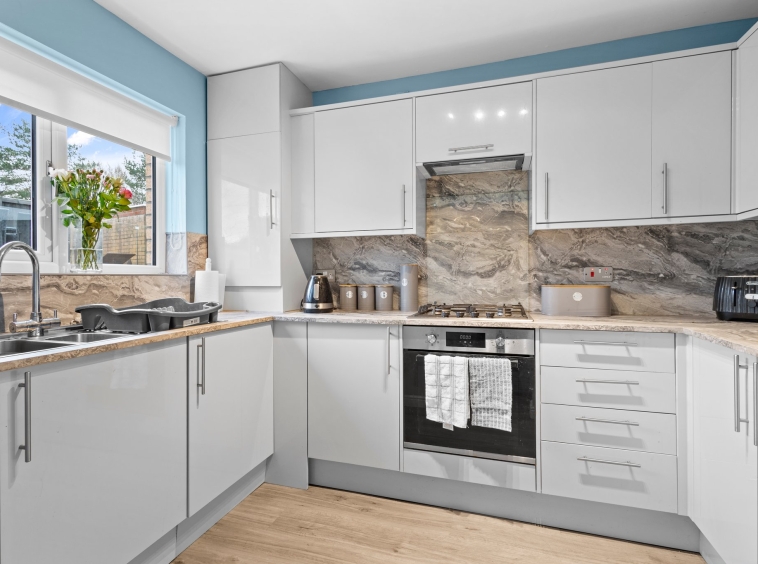 2.95m x 2.07m (9′ 8″ x 6′ 9″) The modern fully fitted kitchen offers a range of white gloss wall and base storage units with complementary work surfaces, stainless steel sink and drainer, integrated appliances including oven, gas hob, washing machine and fridge/freezer. Stylish splashback, tasteful decor, laminate flooring and double glazed window to the rear.