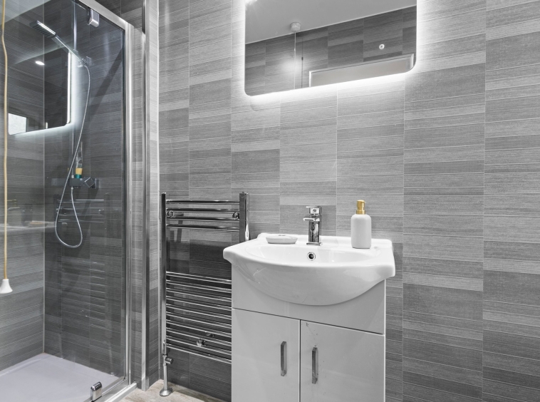 3.05m x 0.92m (10′ 0″ x 3′ 0″) The modern three piece master en suite comprises of a wash hand basin with vanity storage, wc and shower cubicle with mains overhead shower Stylish wet wall finish to walls, heated towel rail, LED mirror, ceiling spotlights and double glazed opaque window to the side.