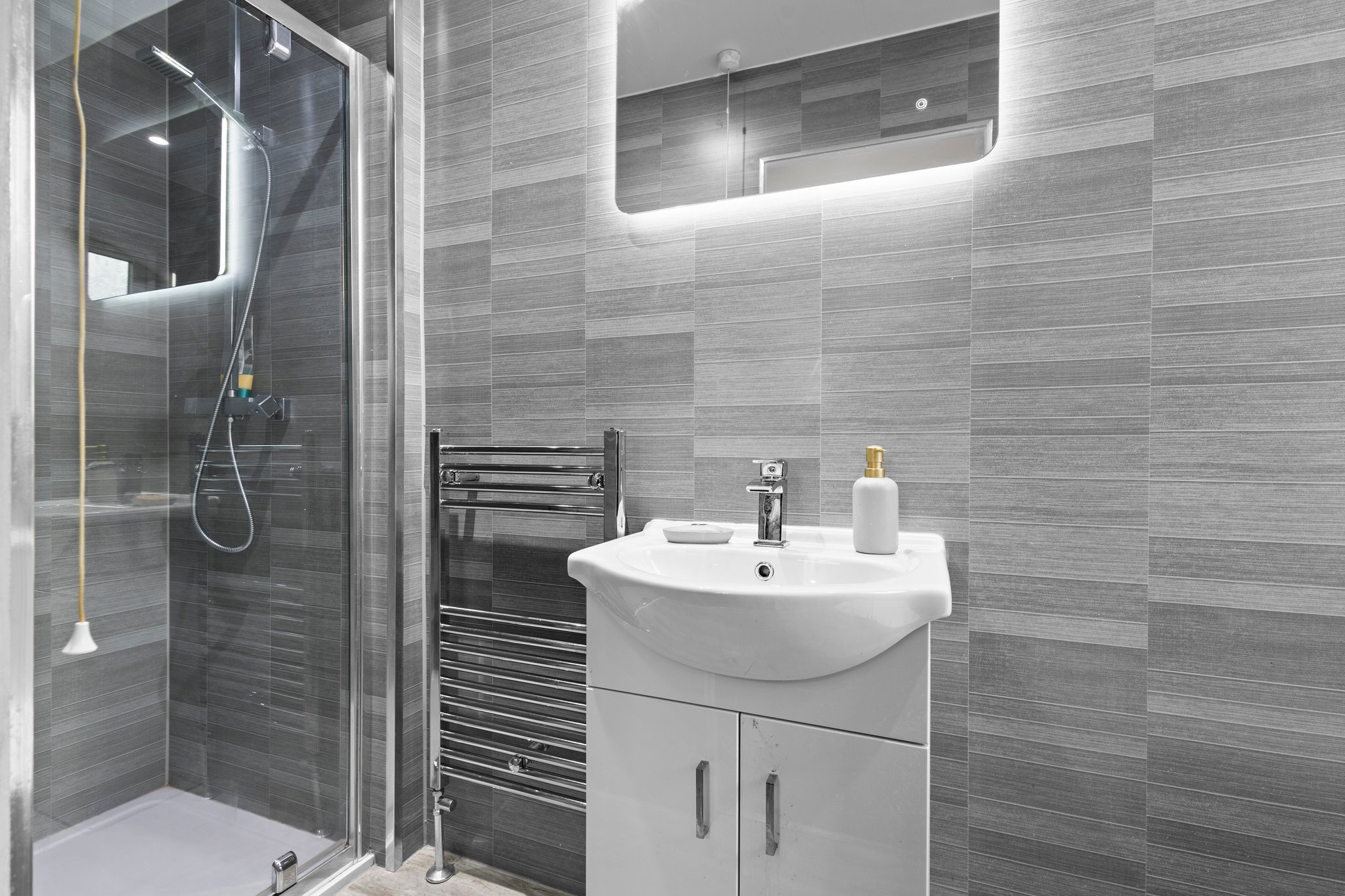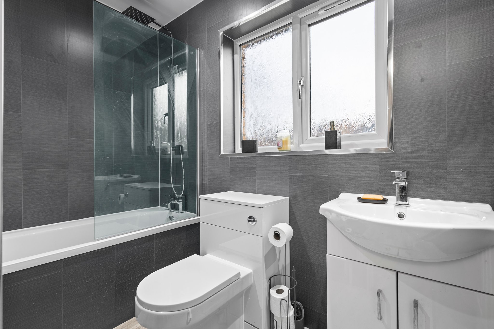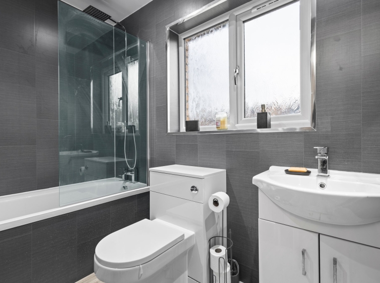 2.47m x 1.92m (8′ 1″ x 6′ 4″) Completing the accommodation is the three piece family bathroom suite comprising of a wash hand basin with vanity storage, wc and bath with overhead mains shower. Modern wet wall finish to walls, laminate flooring, heated towel rail, LED mirror, ceiling spotlights and a double glazed opaque window to the rear.