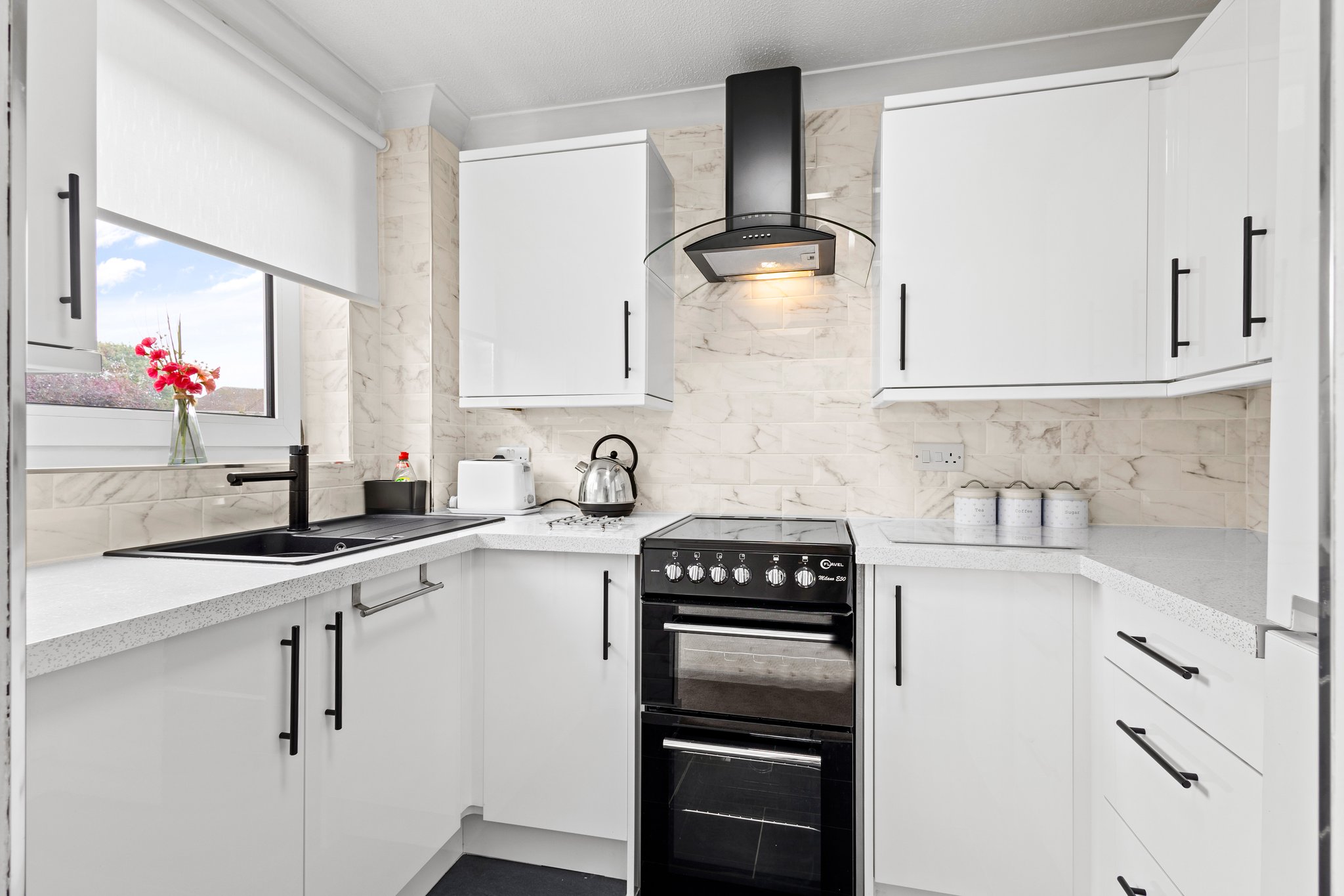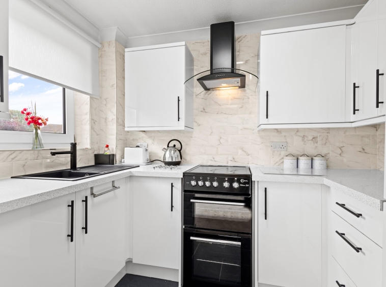1.67m x 2.61m (5′ 6″ x 8′ 7″) Fully fitted kitchen complete with ample wall and base storage units, complimentary work surface, plumbing and space for a cooker, composite sink and drainer, tiled flooring and a double glazed window to the rear
