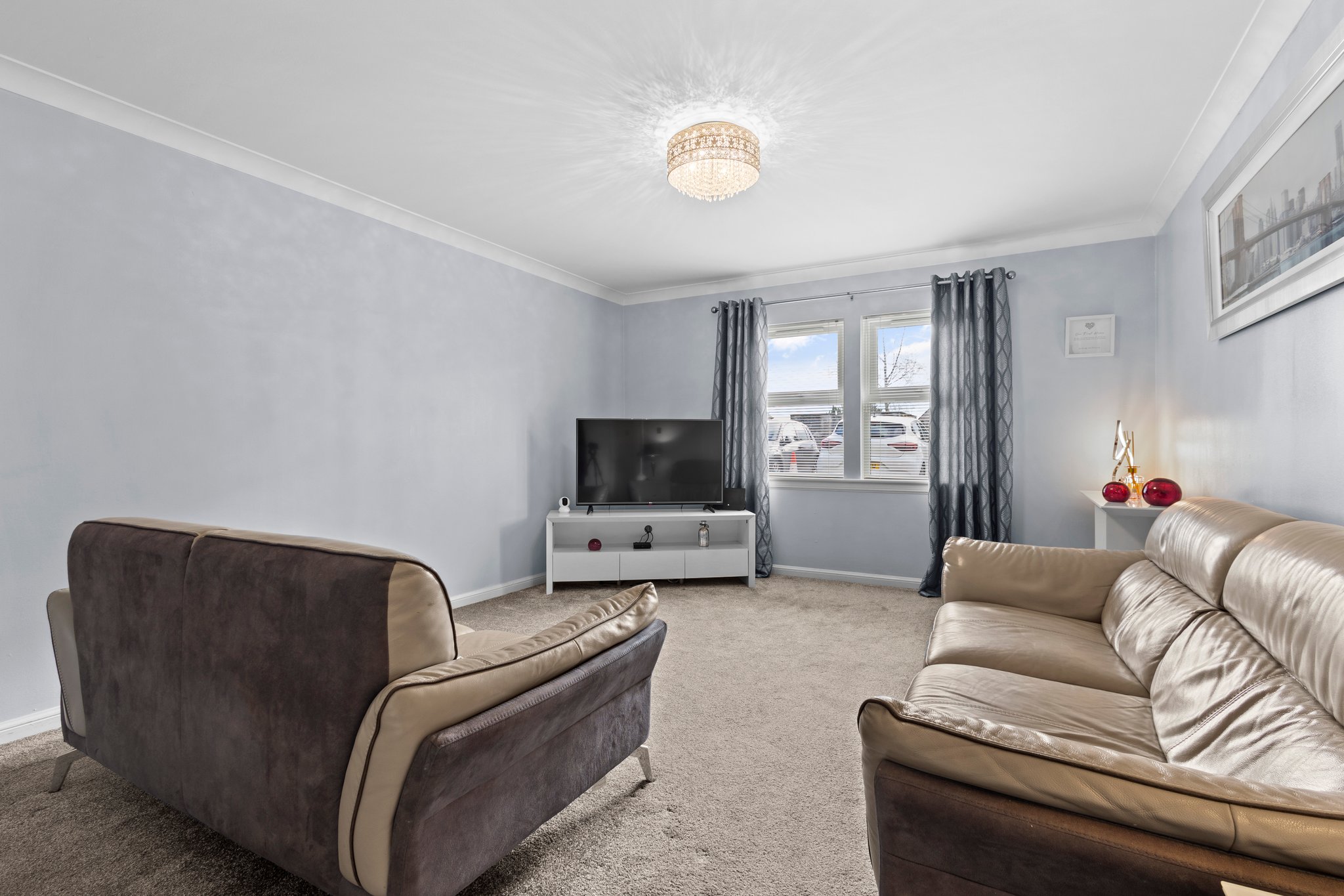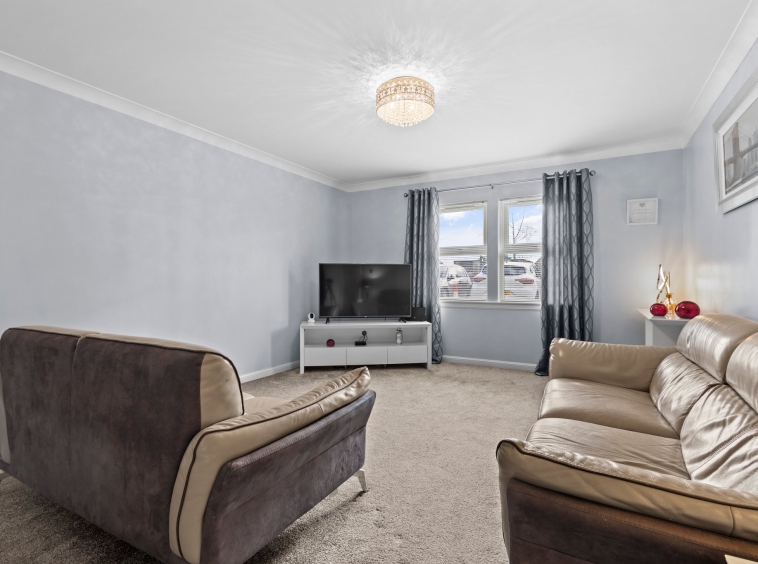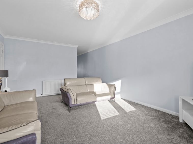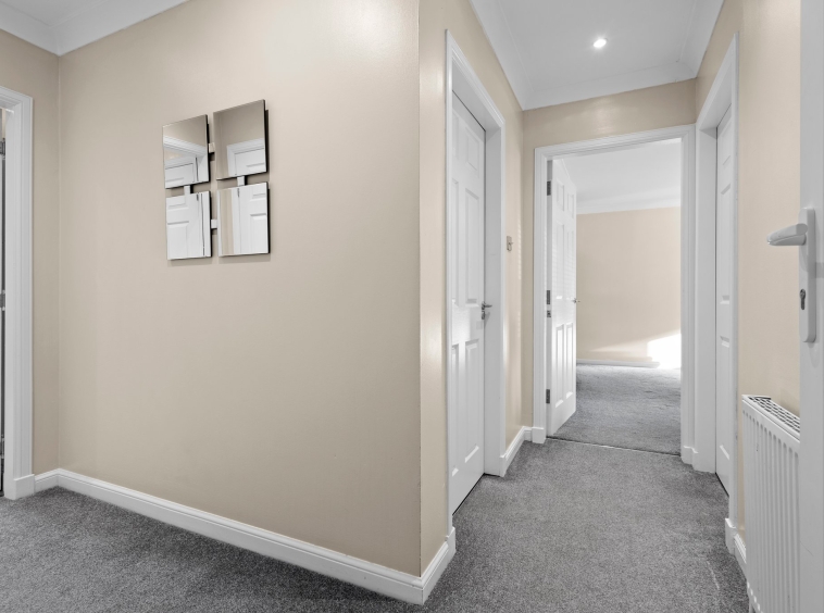 3.17m x 2.94m (10′ 5″ x 9′ 8″) Access is given to a welcoming spacious hallway offering modern decor, ceiling coving and fitted carpet. The hallway gives access to lounge, two bedrooms and bathroom.