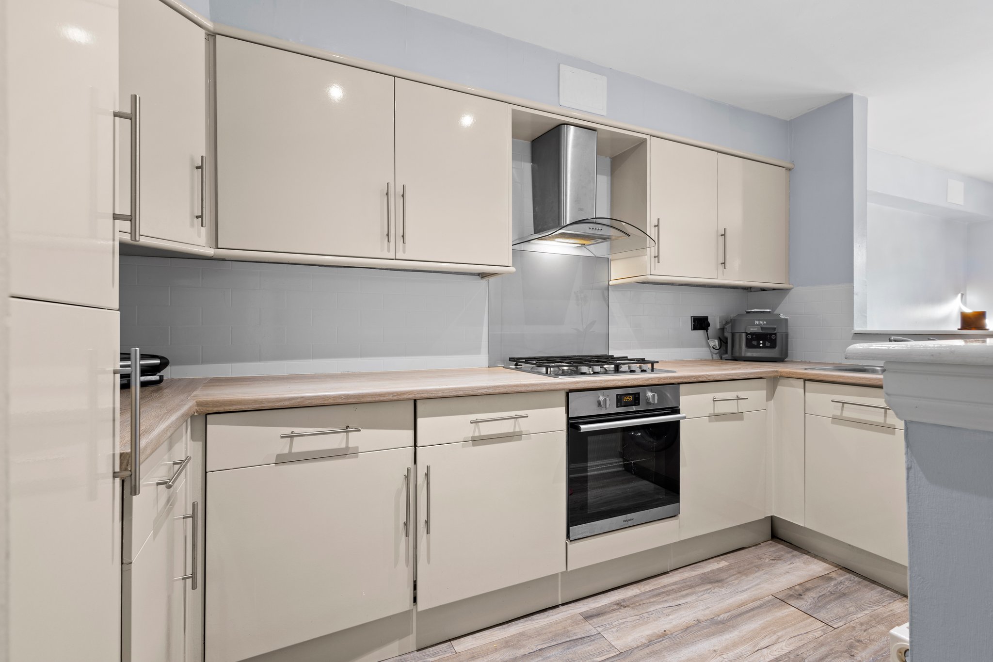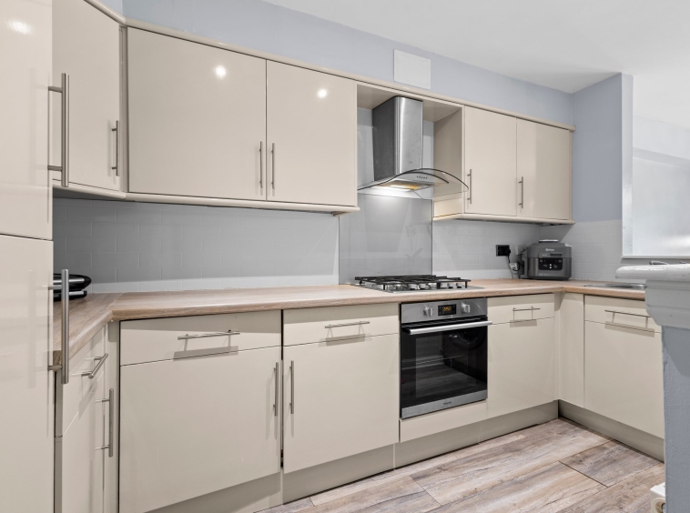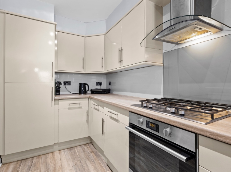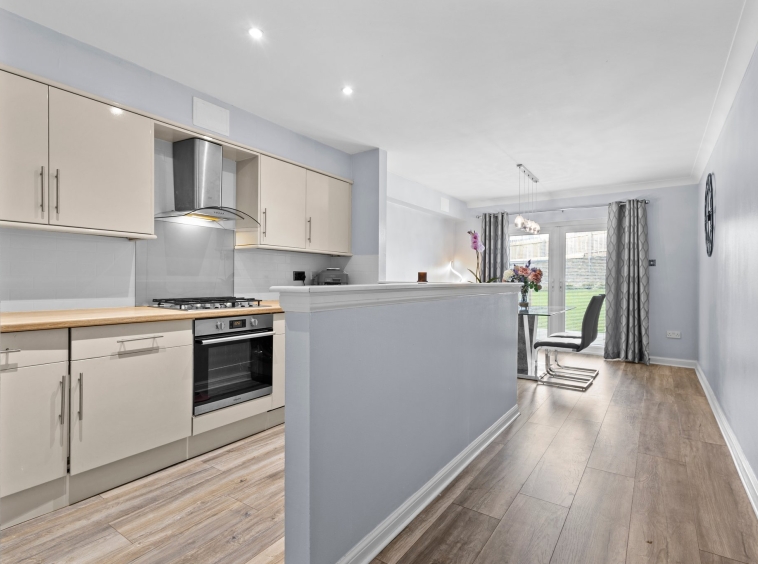 3.71m x 1.96m (12′ 2″ x 6′ 5″) Fully fitted modern kitchen complete with contemporary open plan layout to the dining room, wall and base units providing ample storage with complimentary work surface, integrated oven, gas hob, fridge freezer and dish washer, stainless steel sink and drainer, plumbing and space for a washing machine, neutral decor, ceiling spotlights and laminate flooring.