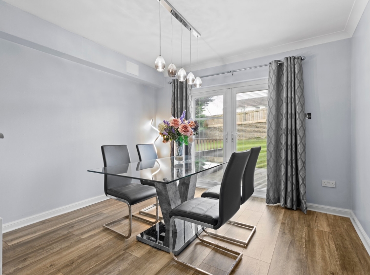 3.11m x 3.35m (10′ 2″ x 11′ 0″) Superb dining room boasting modern decor, plentiful space for fining table and chairs, laminate flooring and double glazed French doors leading to the private patio.