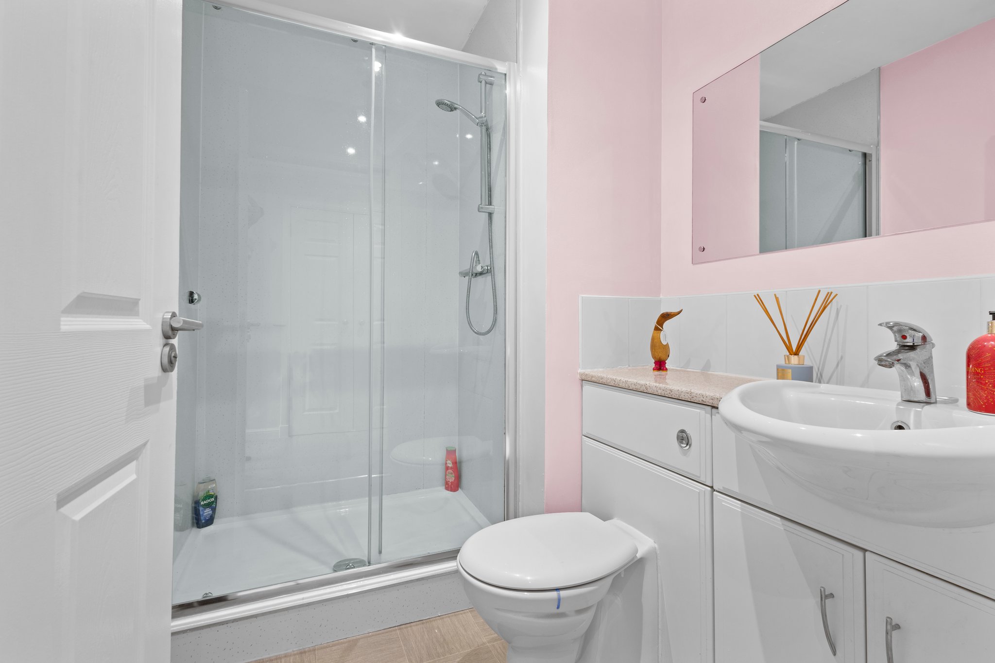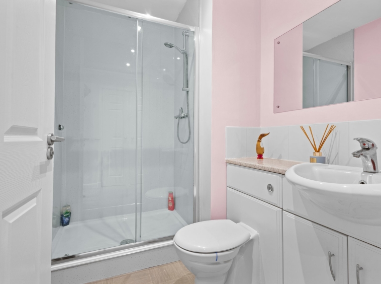 1.69m x 2.20m (5′ 7″ x 7′ 3″) Practical en-suite comprising of a wash hand basin, wc, shower cubicle with mains shower, neutral decor with a wet wall finish around shower, ceiling spotlights, heated towel rail and vinyl flooring.