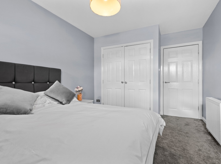 4.32m x 2.94m (14′ 2″ x 9′ 8″) Spacious double bedroom with neutral decor, double fitted wardrobes, fitted carpet and two double glazed windows to the front.