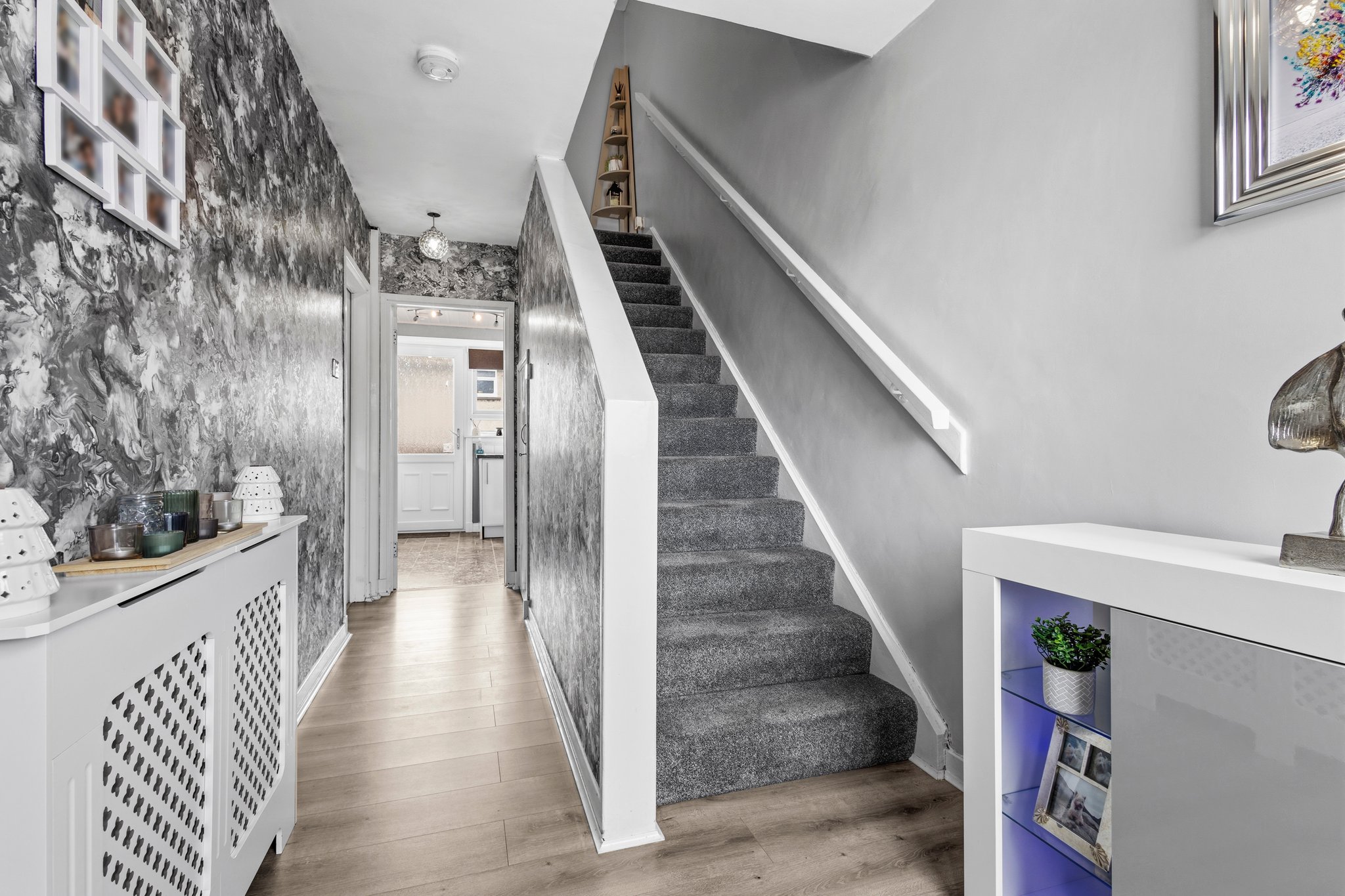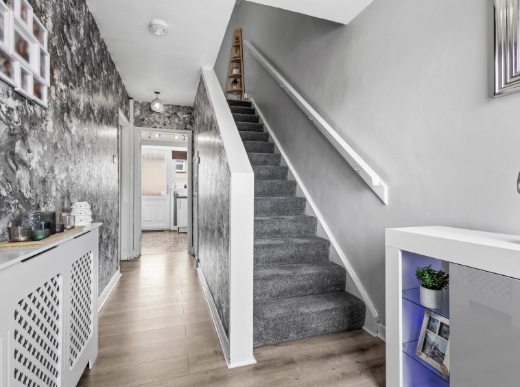 1.97m x 5.07m (6′ 6″ x 16′ 8″) Access is given to a welcoming spacious hallway offering contemporary stylish decor, practical under stairs storage cupboard and laminate flooring. The hallway gives access to the lounge, kitchen and a carpeted staircase leads to the upper level.