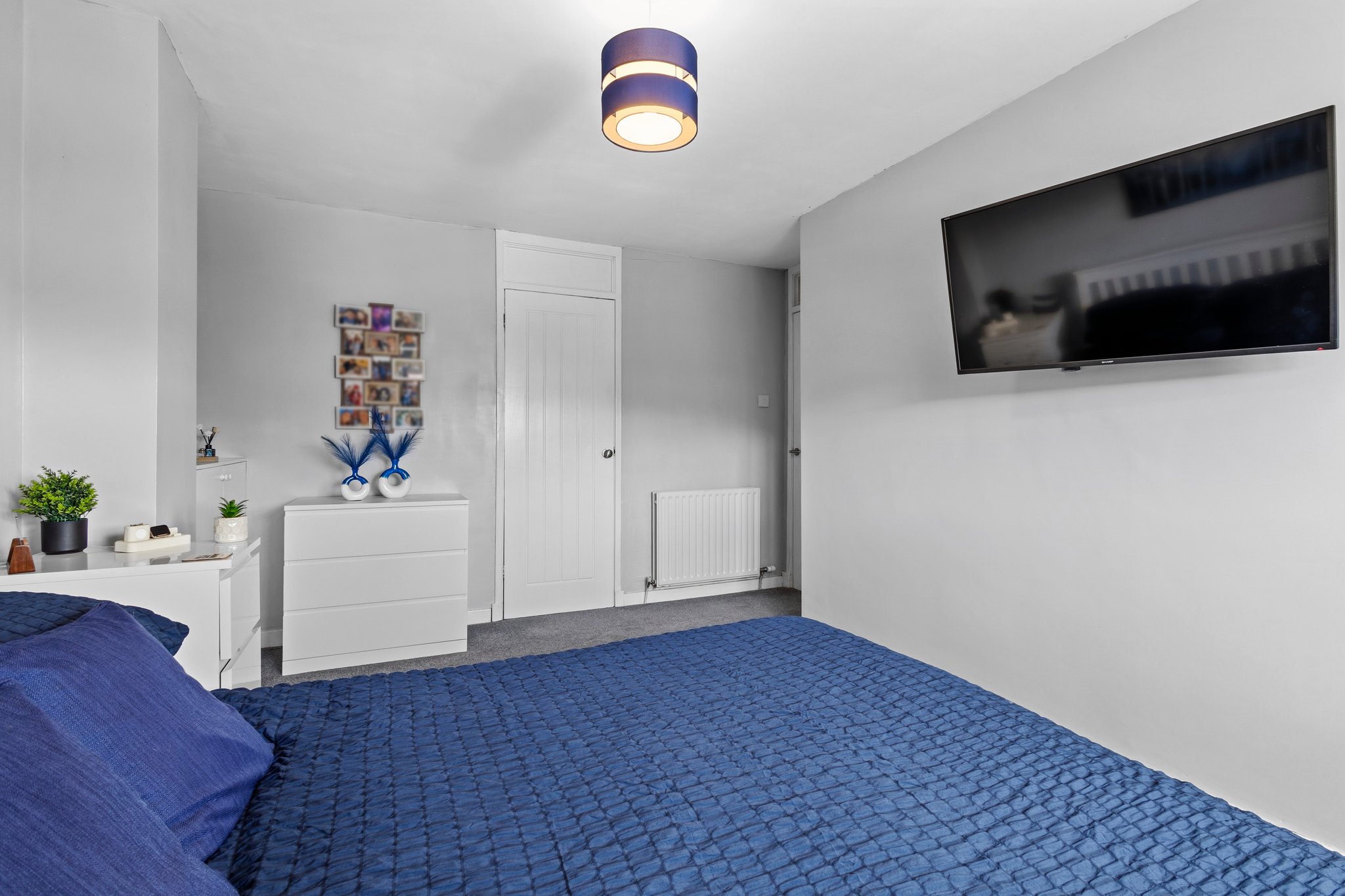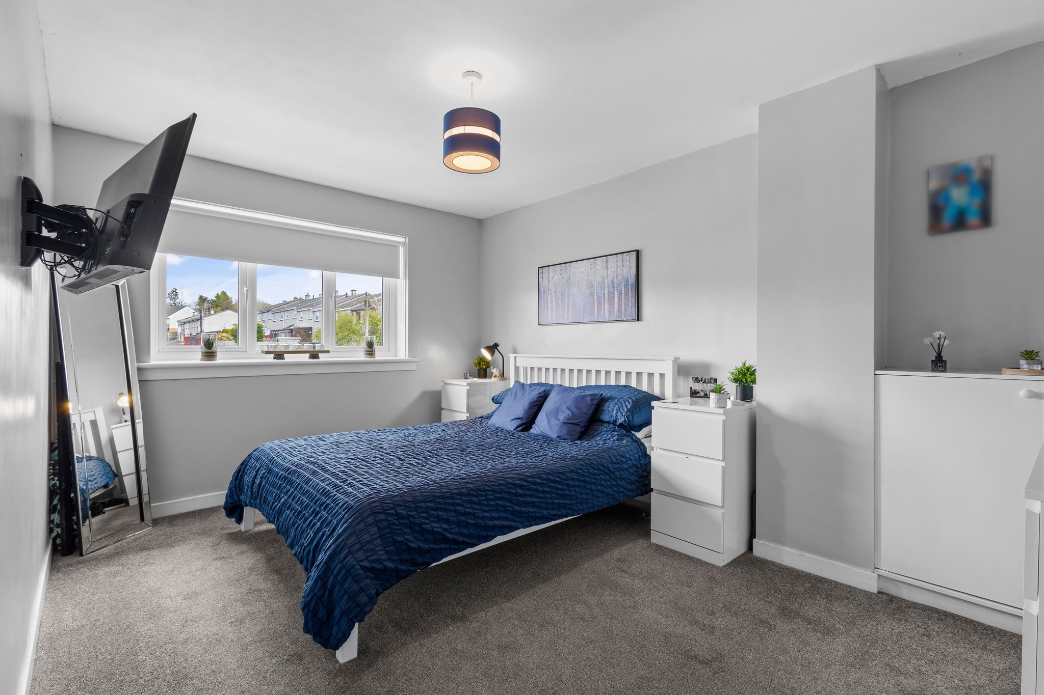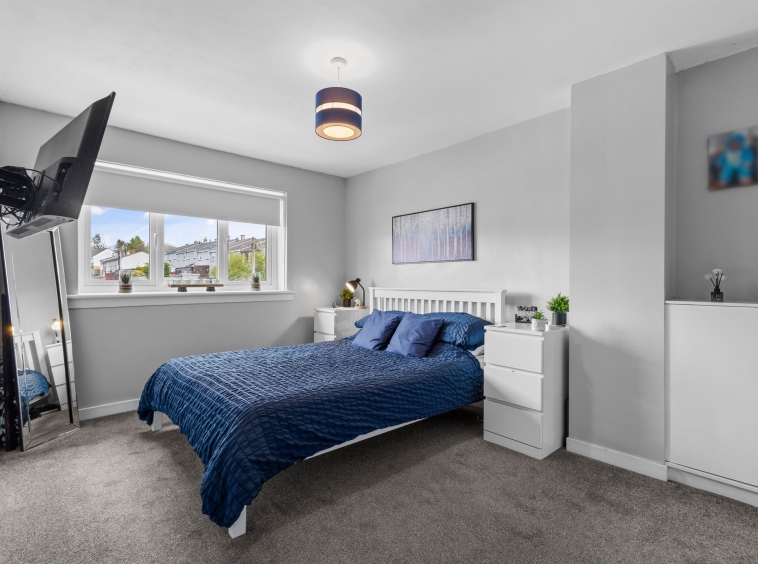 3.47m x 2.91m (11′ 5″ x 9′ 7″) Spacious double bedroom with contemporary decor, two storage cupboards, fitted carpet and a double glazed window to the rear.