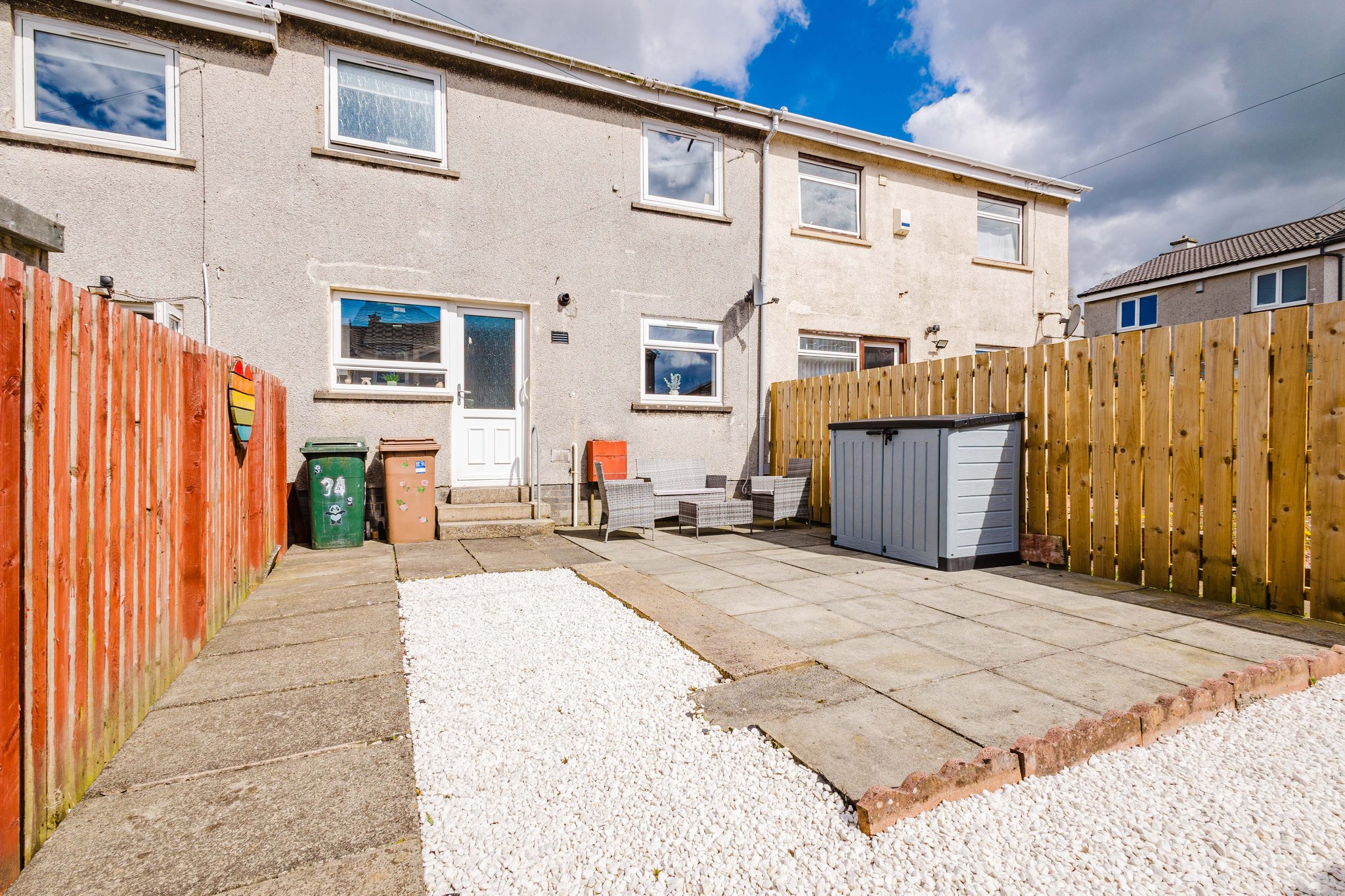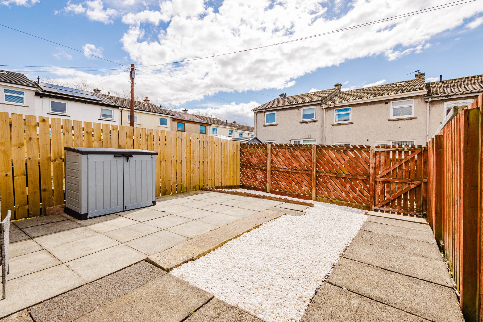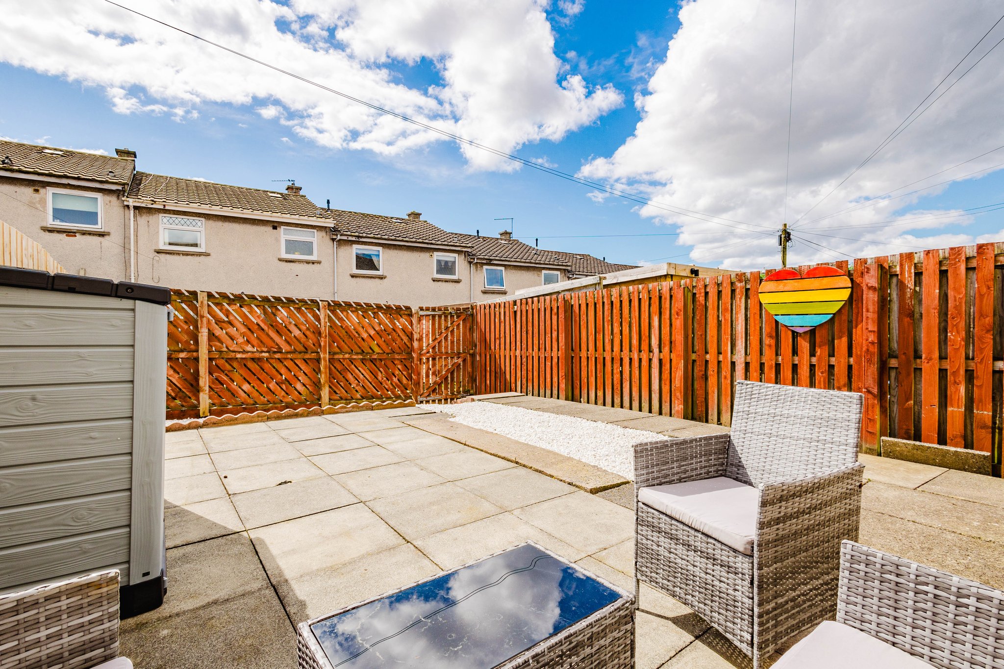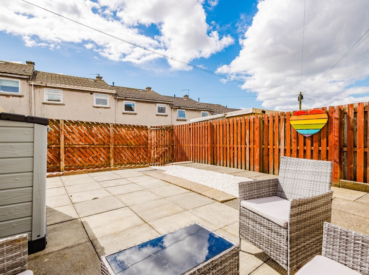 The property further benefits from private gardens to both the front and rear. The front garden is fully enclosed and finished with decorative chips, while the rear garden has been thoughtfully designed for low maintenance, featuring a chipped area and a generous paved patio—ideal for outdoor dining and entertaining.