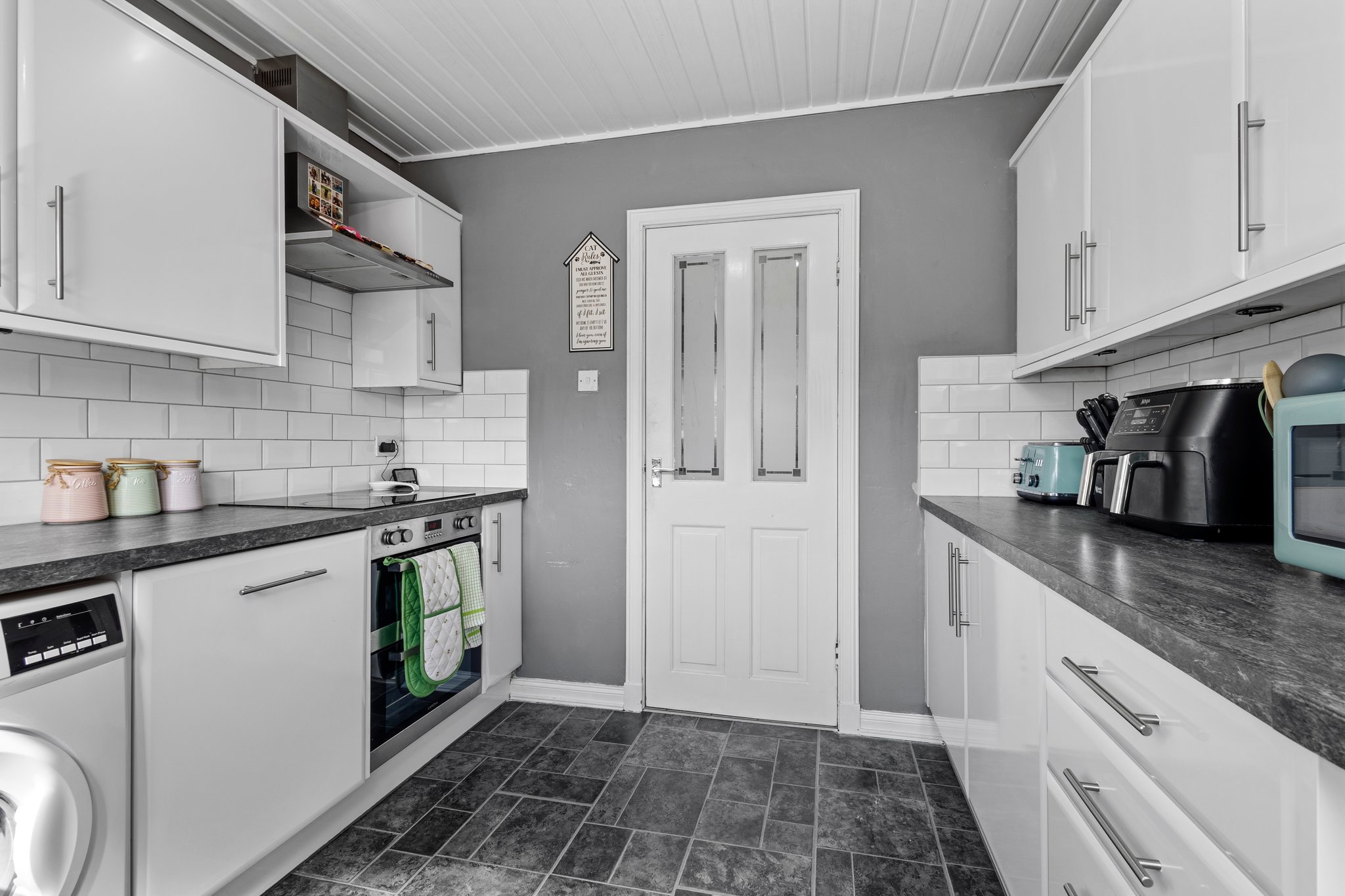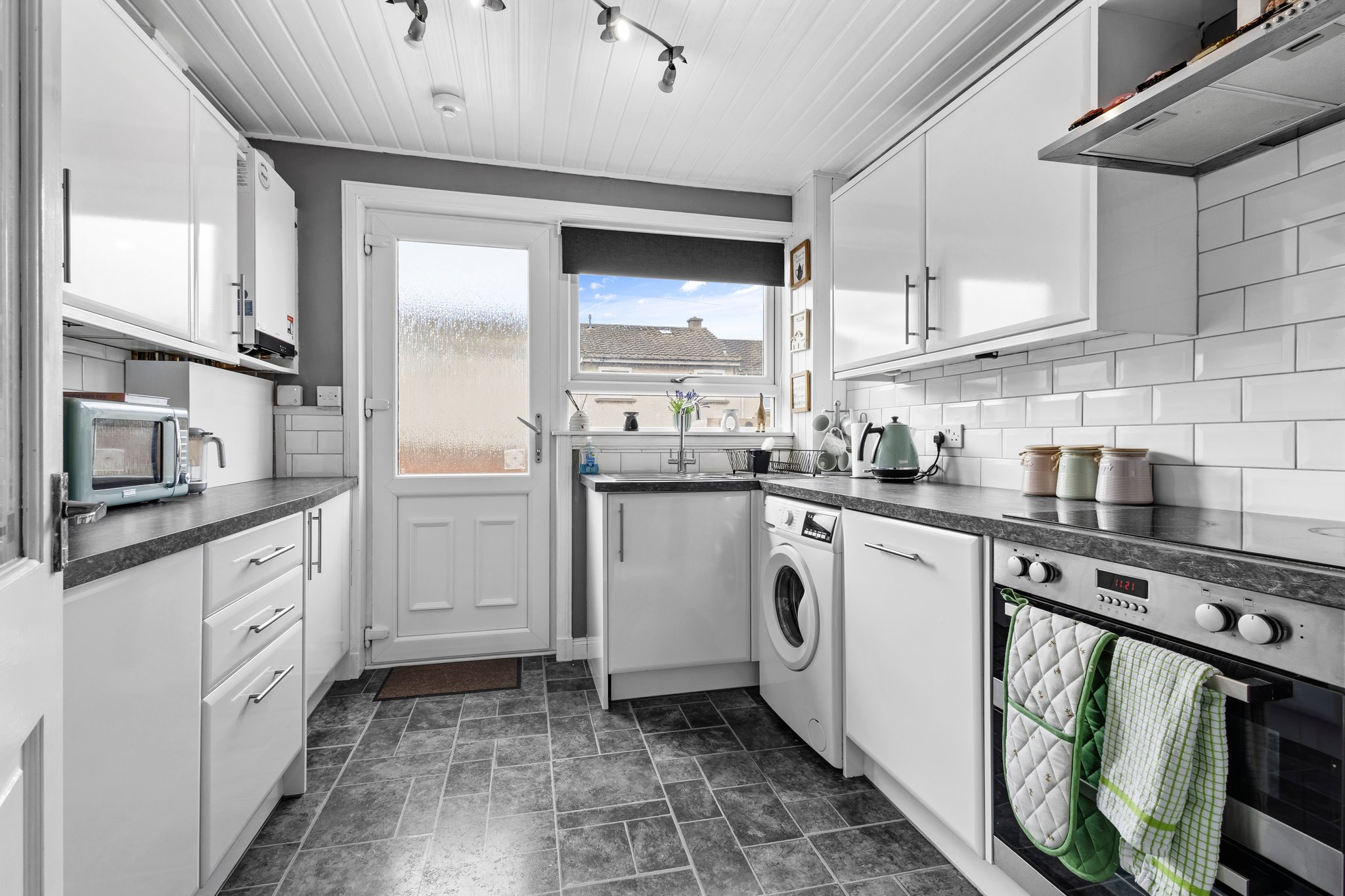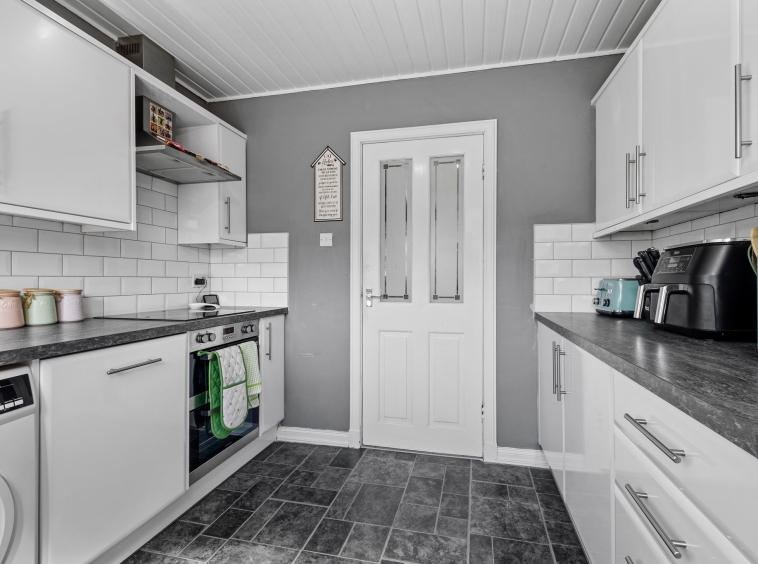 2.68m x 2.75m (8′ 10″ x 9′ 0″) Fully fitted modern kitchen complete with ample wall and base storage units, complimentary work surface, integrated oven, induction hob and hood, plumbing and space for a washing machine, stainless steel sink and drainer, stylish decor with brick effect white tiled splashback, vinyl flooring, a double glazed window to the rear and door access to the rear garden.