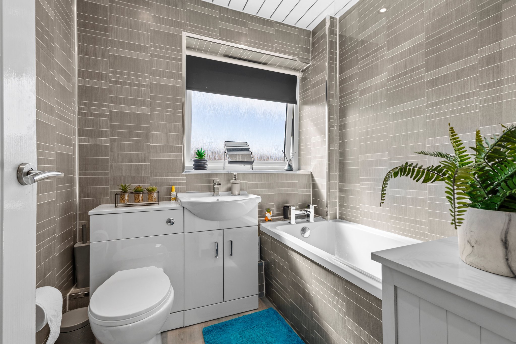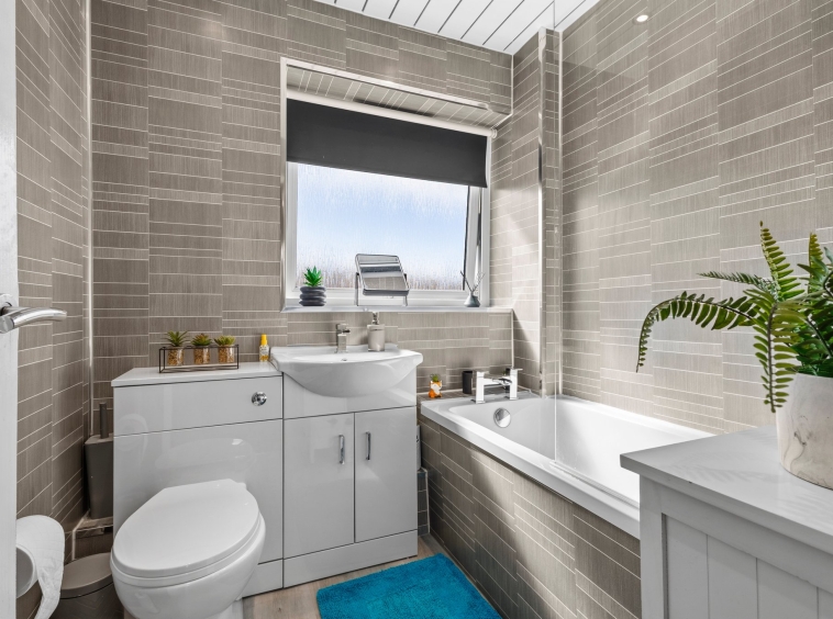 1.96m x 1.83m (6′ 5″ x 6′ 0″) Completing the accommodation is the family bathroom comprising of a wash hand basin with vanity unit, wc, bath with overhead shower, stylish wet wall finish, vinyl flooring and a double glazed window to the rear.