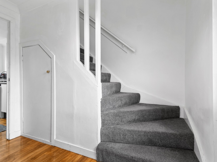 2.65m x 0.85m (8′ 8″ x 2′ 9″) The welcoming entrance hallway offers crisp white decor with laminate flooring, practical understairs storage cupboard and carpeted staircase leading to the upper level. Door access to the lounge and kitchen.