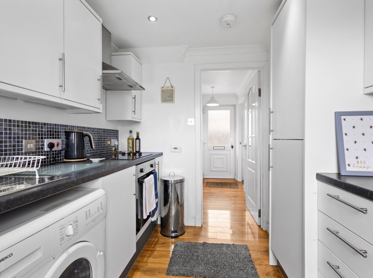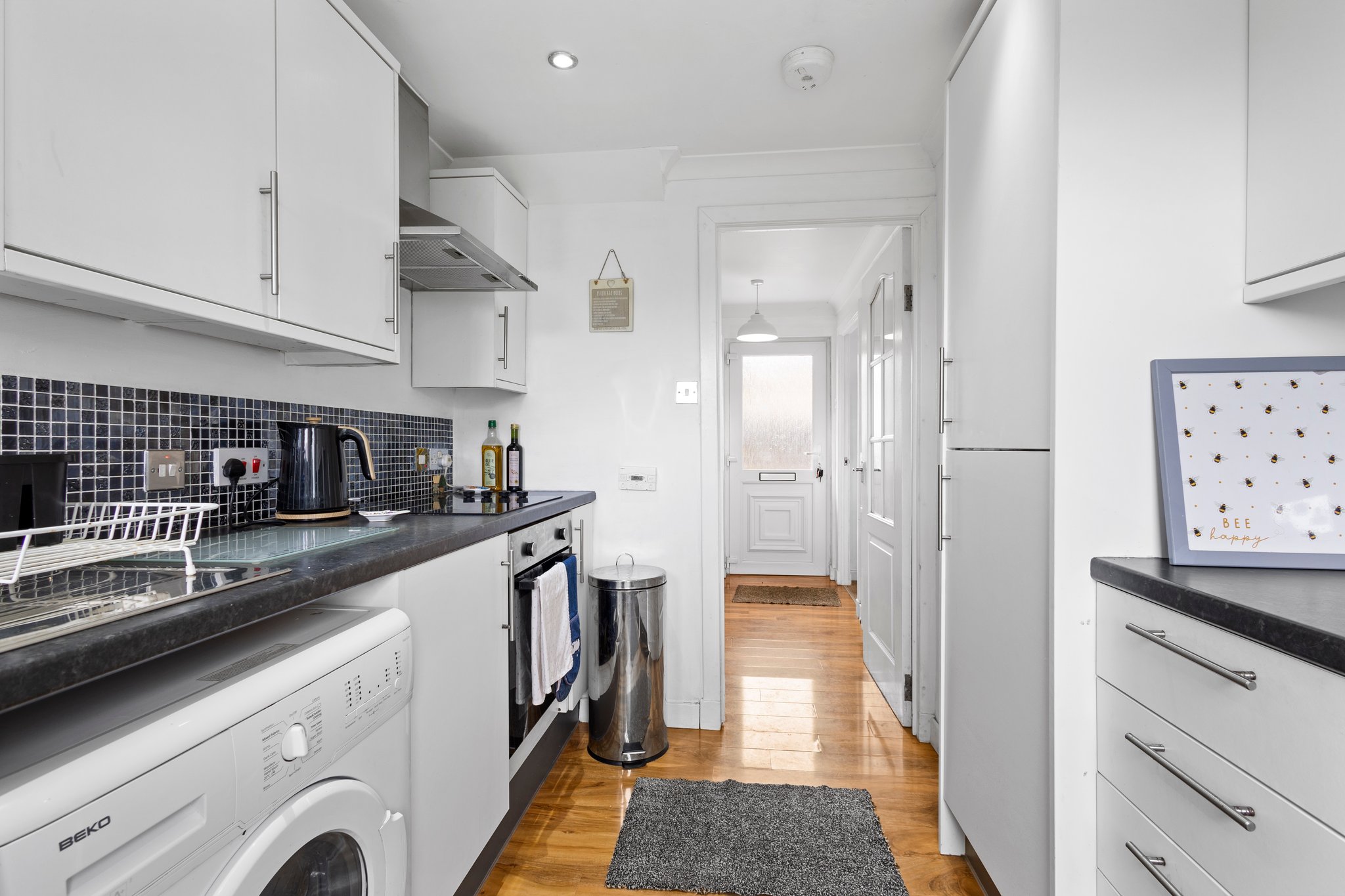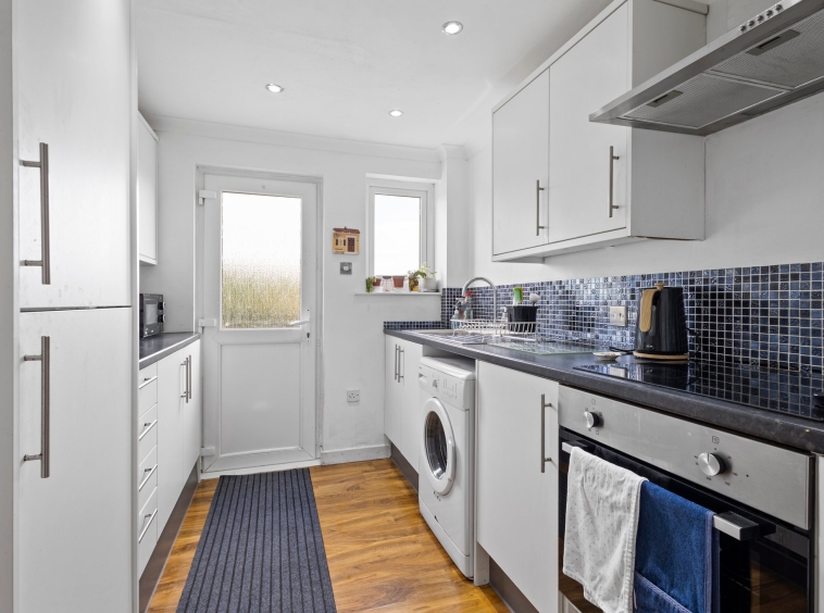 2.88m x 2.37m (9′ 5″ x 7′ 9″) The modern fitted kitchen offers a range of white wall and base storage units with complementary work surfaces, integrated oven, electric hob and hood, plumbing/space for washing machine. Crisp white decor, tiled splashback, laminate flooring, double glazed window to the rear and door leading out into the rear gardens.