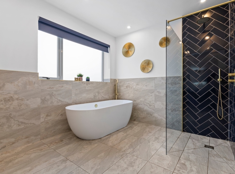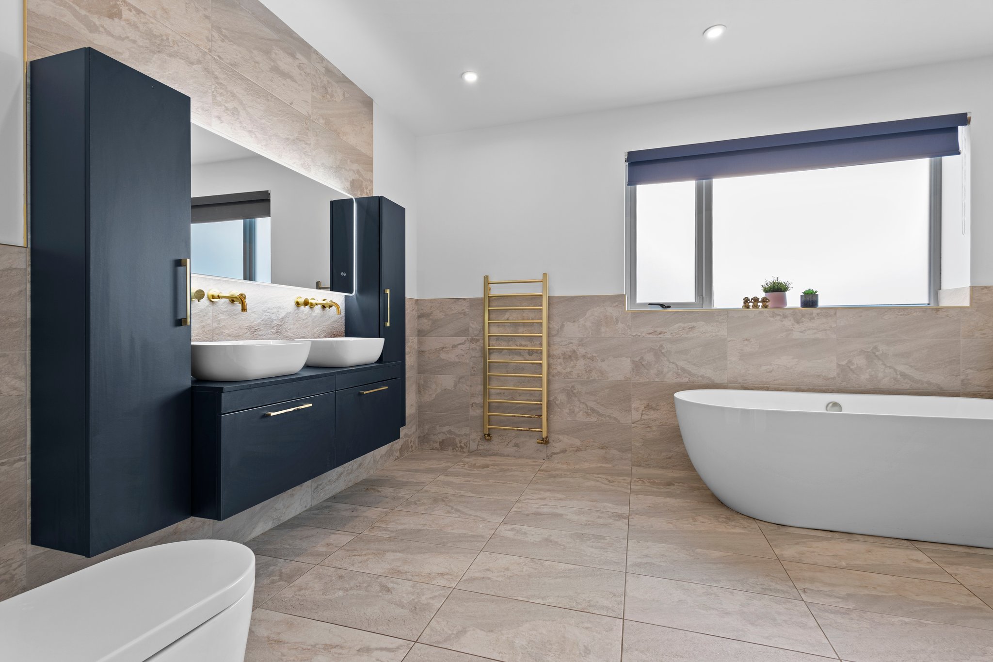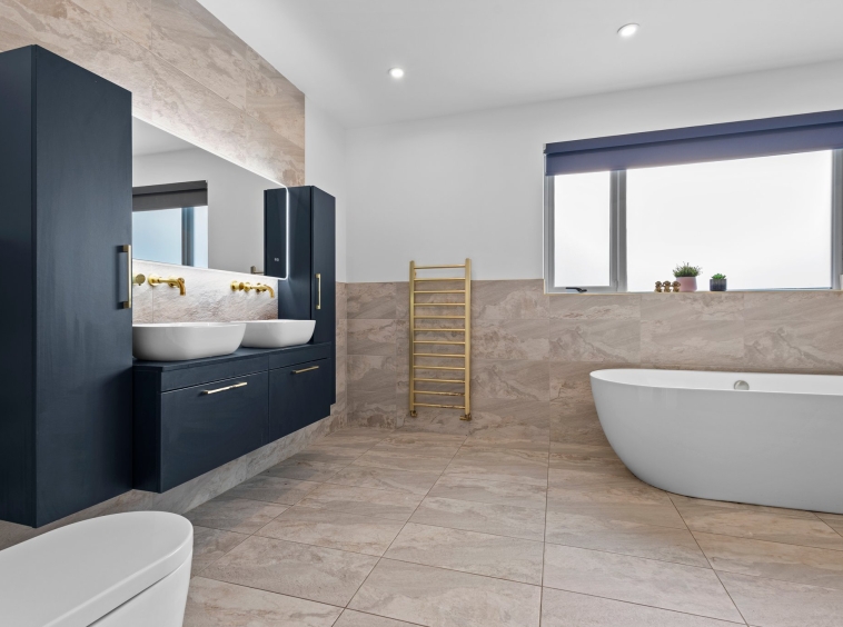 3.78m x 3.24m (12′ 5″ x 10′ 8″) Impressive four piece family bathroom comprising of “His ‘n’ Hers” wash hand basin unit with vanity storage, wc, freestanding bath and walk in shower cubicle with mains overhead shower. Modern tiling around walls, tiled flooring, heated towel rail, ceiling spotlights and double glazed opaque window to the rear.