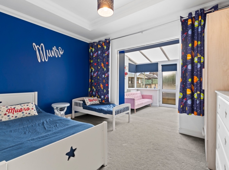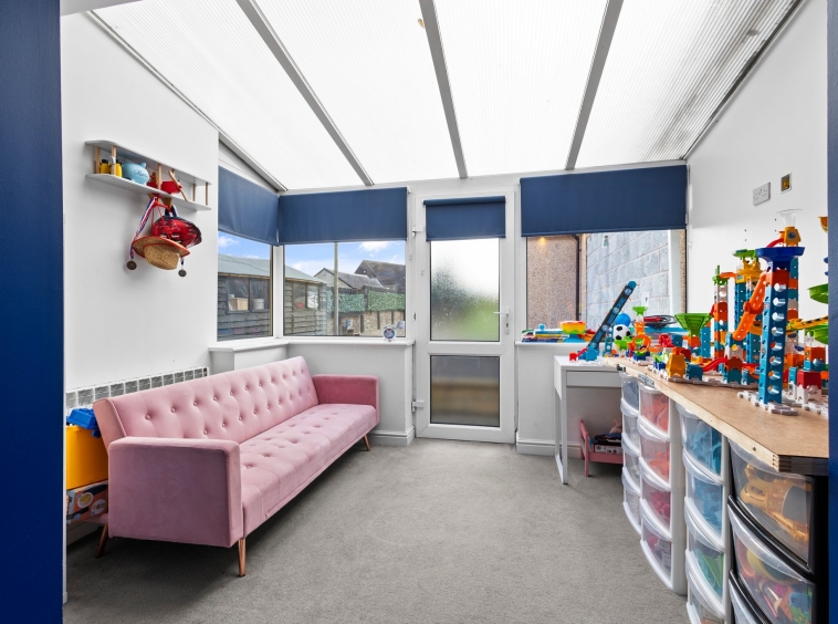 3.63m x 5.17m (11′ 11″ x 17′ 0″) Bedroom three is a double room providing modern children’s decor, ceiling coving and fitted carpet. A unique apartment with an idyllic conservatory forming part of the room, currently utilised as a play area, providing door access into the rear gardens.