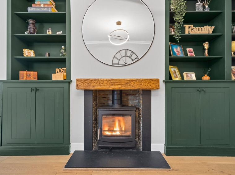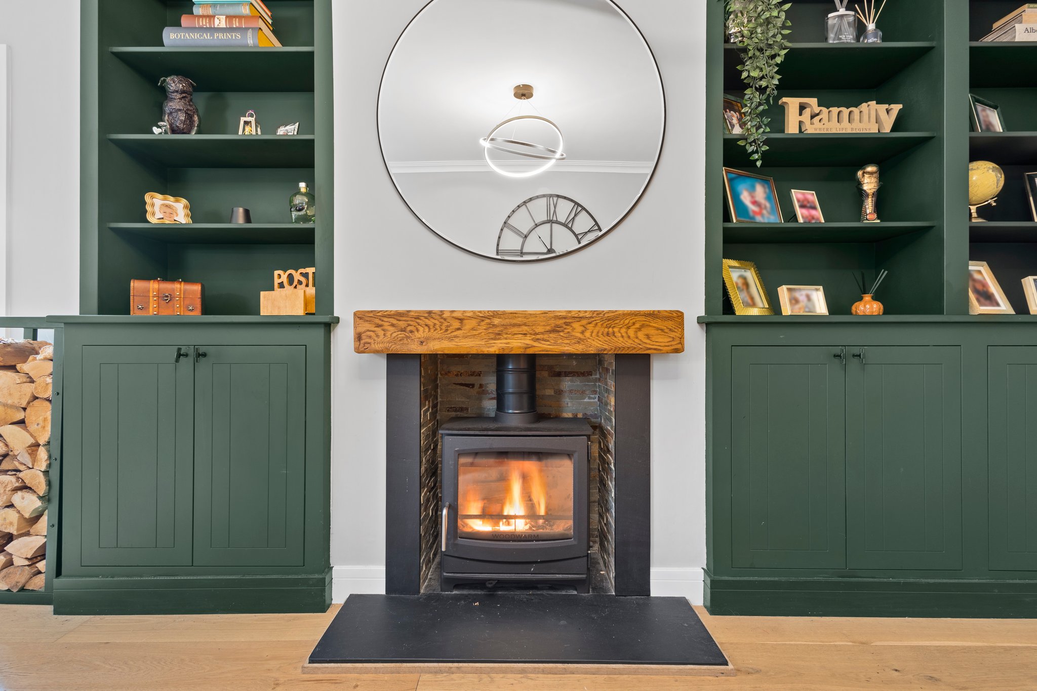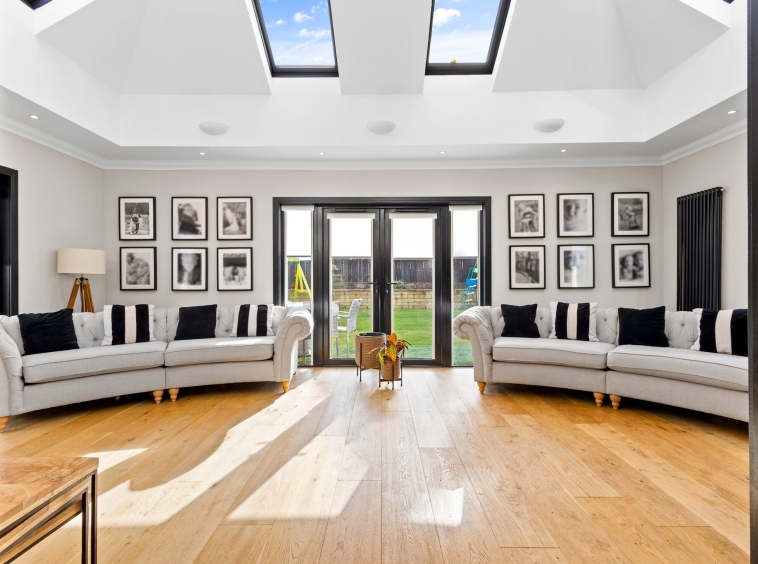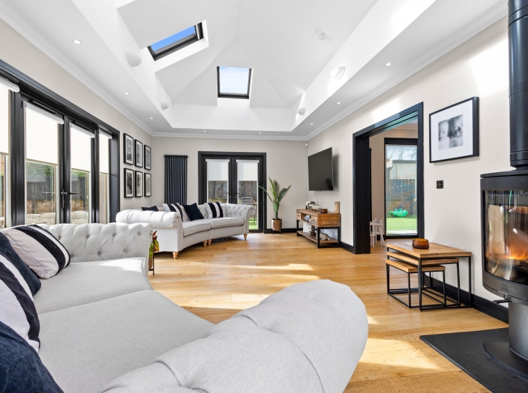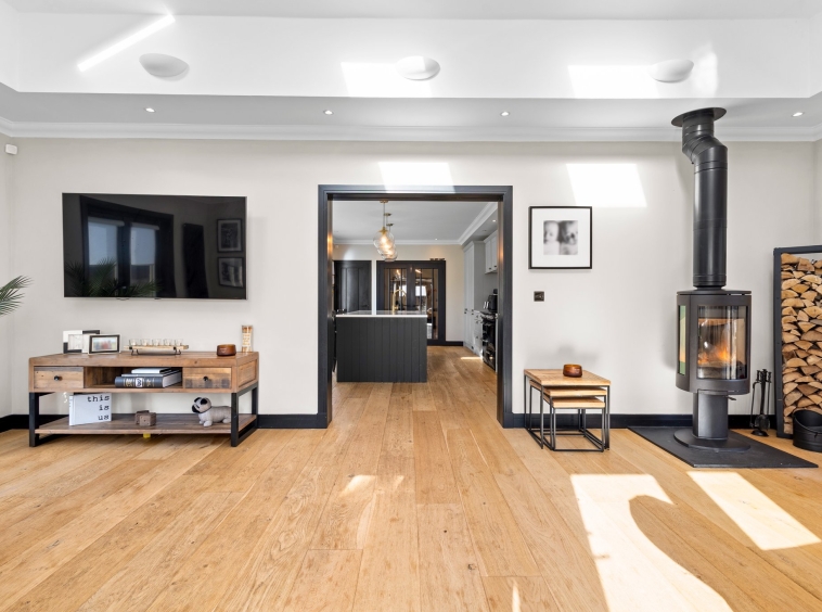 6.69m x 3.96m (21′ 11″ x 13′ 0″) The striking formal lounge is an impressive main living apartment positioned to the rear of the property comprising of tasteful decor with ceiling coving and hardwood flooring, feature woodburning stove and plentiful space for freestanding furniture. An abundance of light floods this apartment a selection of skylights, dual aspect double glazed windows, and three sets of French doors to the sides and rear, leading out into the gardens. Open access to the kitchen.
