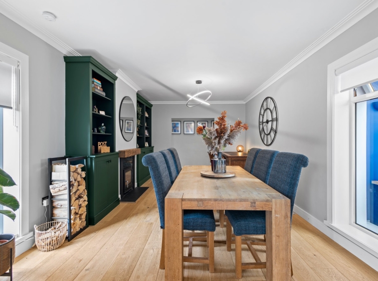 2.79m x 2.79m, 4.14m x 1.16m The welcoming entrance hallway sets the tone for this stunning home offering modern decor with hardwood flooring, practical storage cupboard and door access to the dining room, master bedroom, family bathroom and inner hallway leading to bedrooms two and three, and shower room.