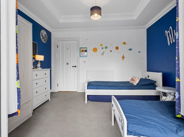 4.52m x 3.77m (14′ 10″ x 12′ 4″) The second double bedroom is complete with neutral decor, ceiling coving, fitted carpet and two wardrobes. Double glazed window to the front and plentiful space for freestanding furniture.