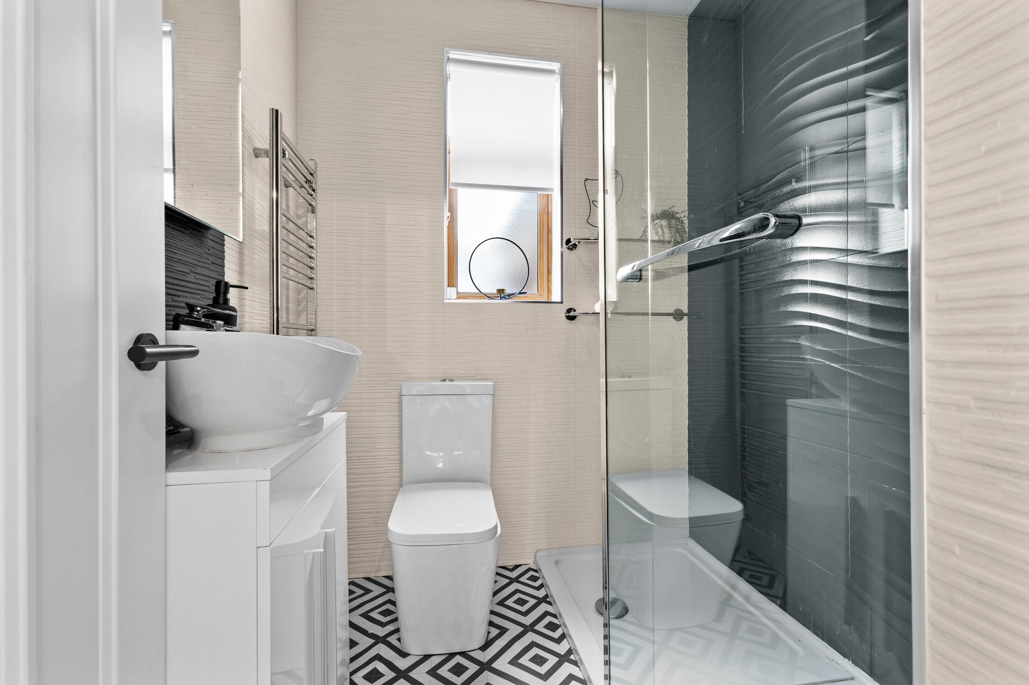 1.85m x 1.84m (6′ 1″ x 6′ 0″) Three piece shower room comprising of a wash hand basin with vanity storage, wc and shower cubicle with mains overhead shower. Contemporary fully tiled walls, vinyl flooring, heated towel rail, ceiling spotlights and side facing double glazed opaque window.