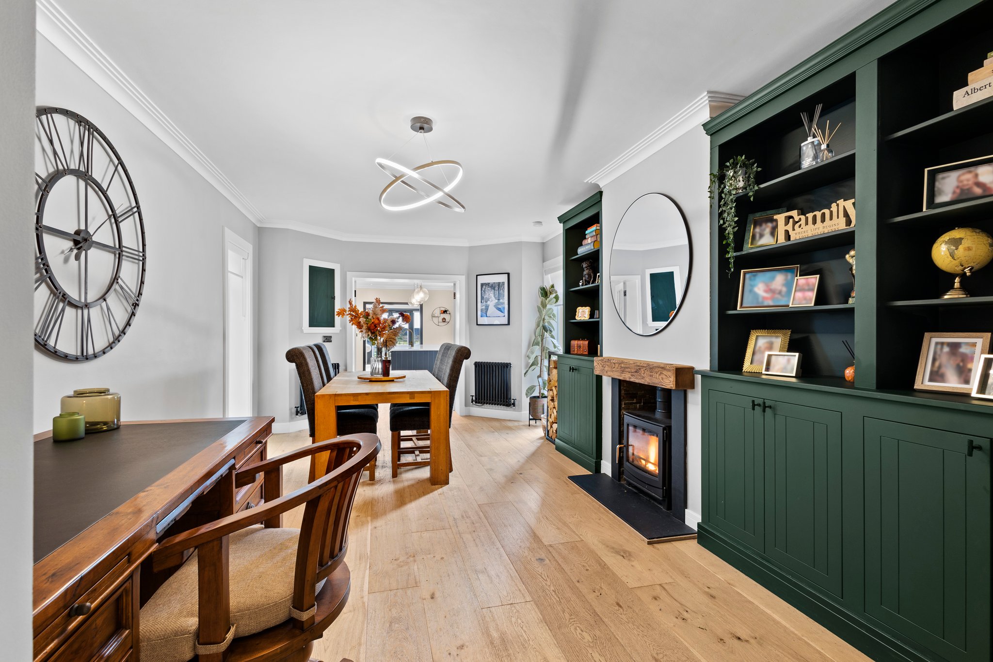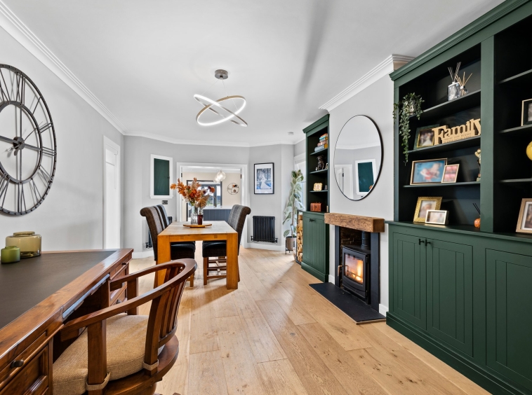6.25m x 3.69m (20′ 6″ x 12′ 1″) Complete with tasteful decor, hardwood flooring and a feature wood burning stove, the larger than average dining room is a generous apartment and is side facing with a double glazed window. A flexible apartment which provides access to the kitchen.