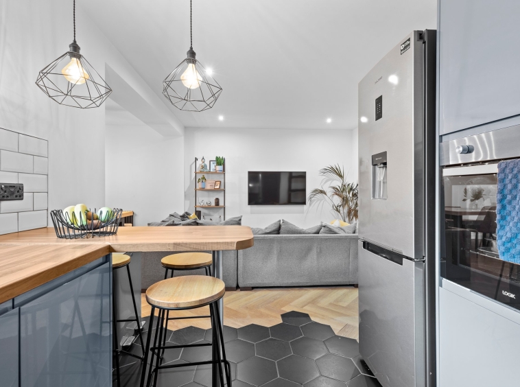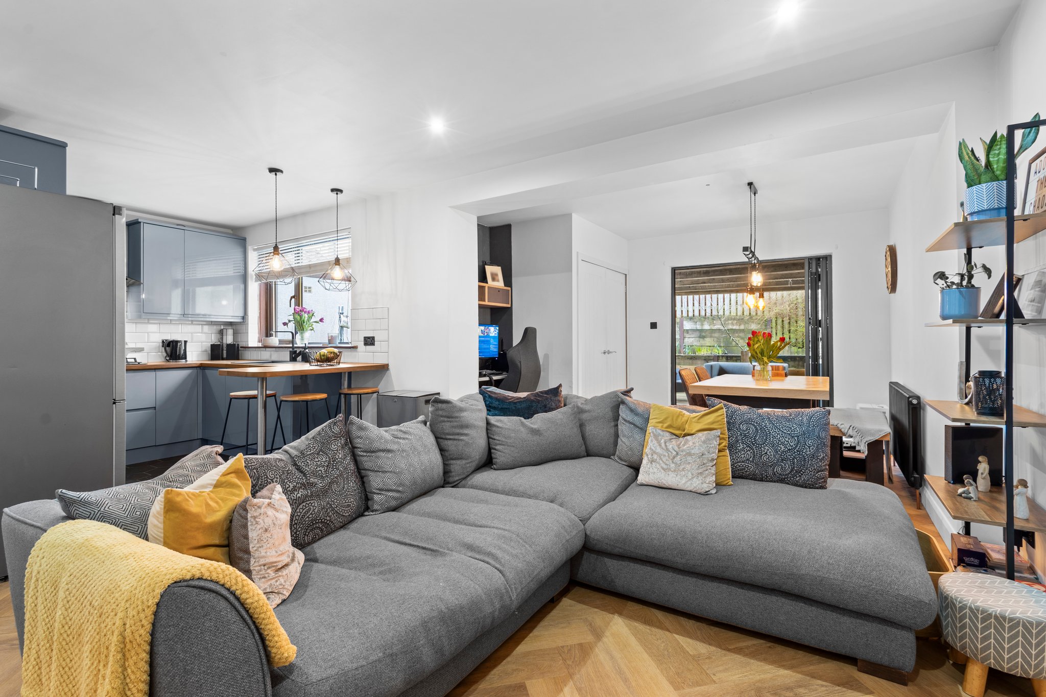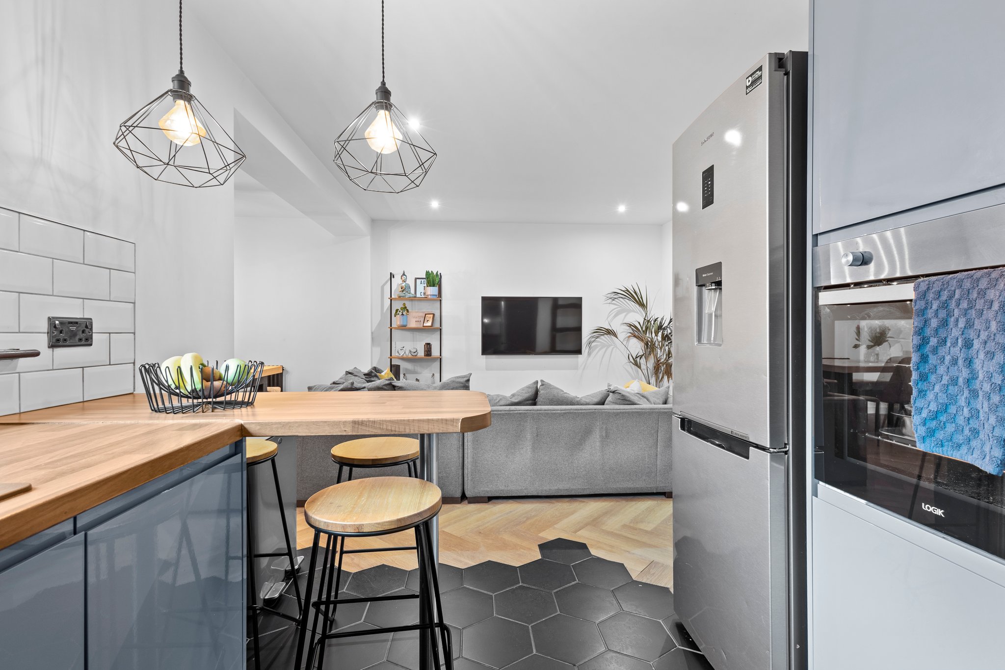 2.58m x 2.78m (8′ 6″ x 9′ 1″) Fully fitted modern kitchen complete with a stunning open plan layout, stylish wall and base units providing ample storage with a complimentary work surface, integrated oven, gas hob, composite sink, plumbing and space for a fridge freezer, modern decor, breakfast bar seating area, ceiling spotlights, tiled flooring and a double glazed window to the rear.