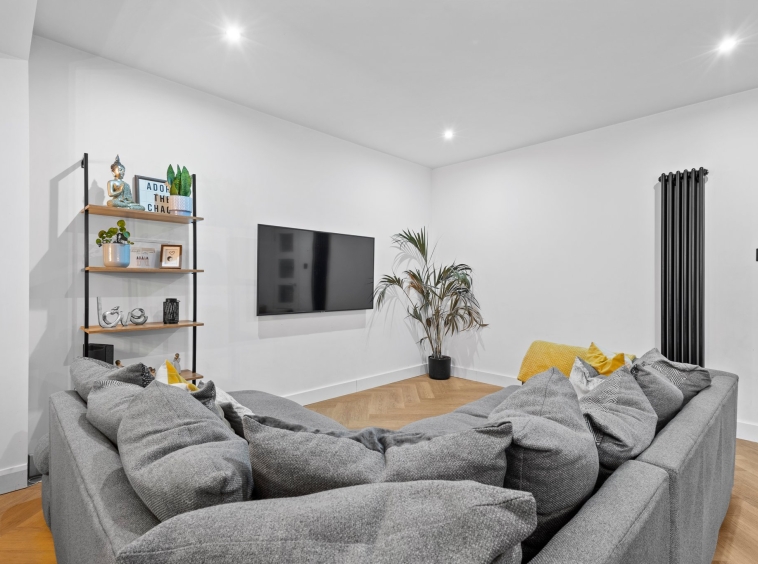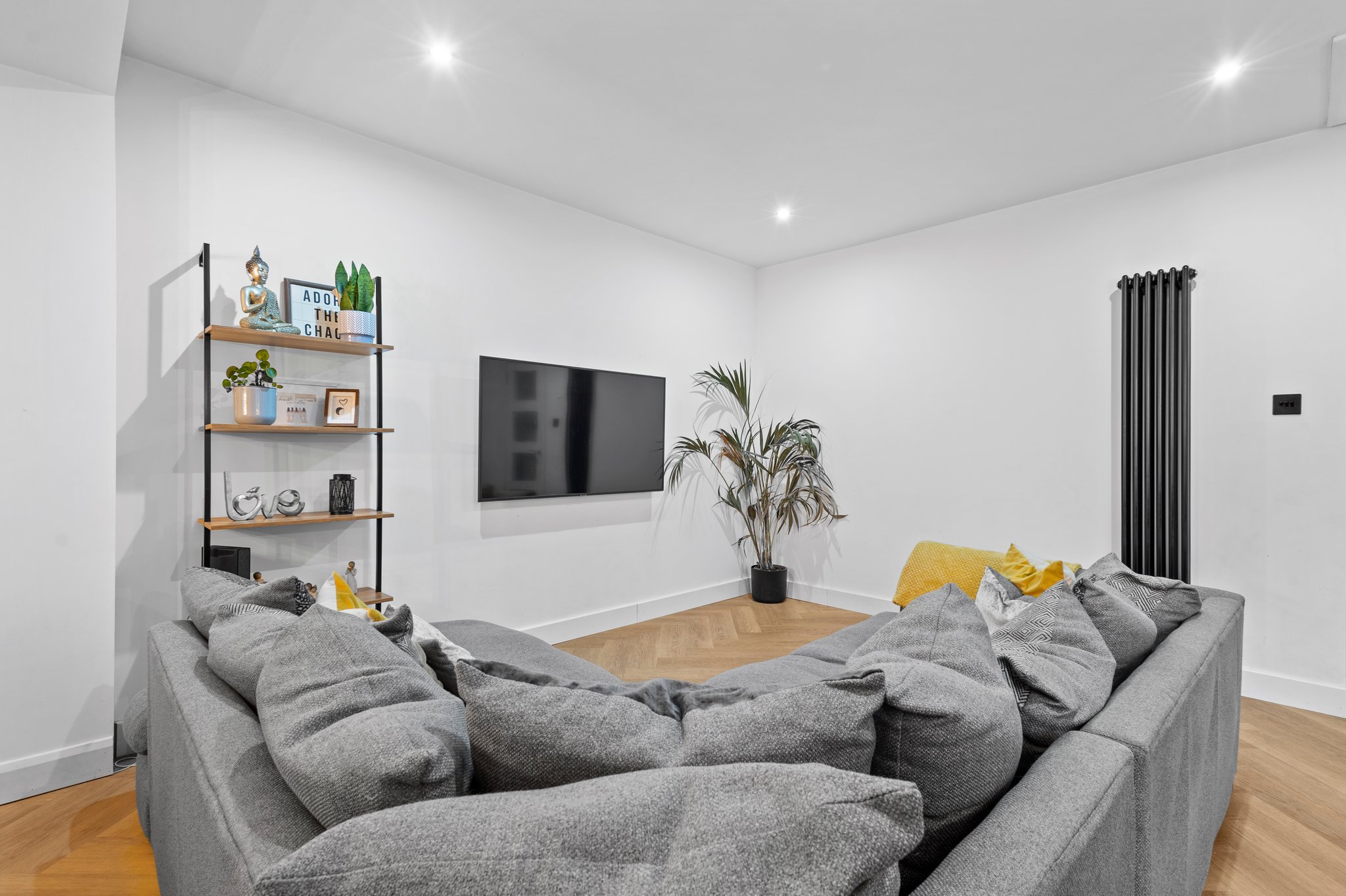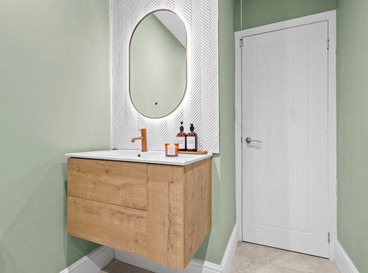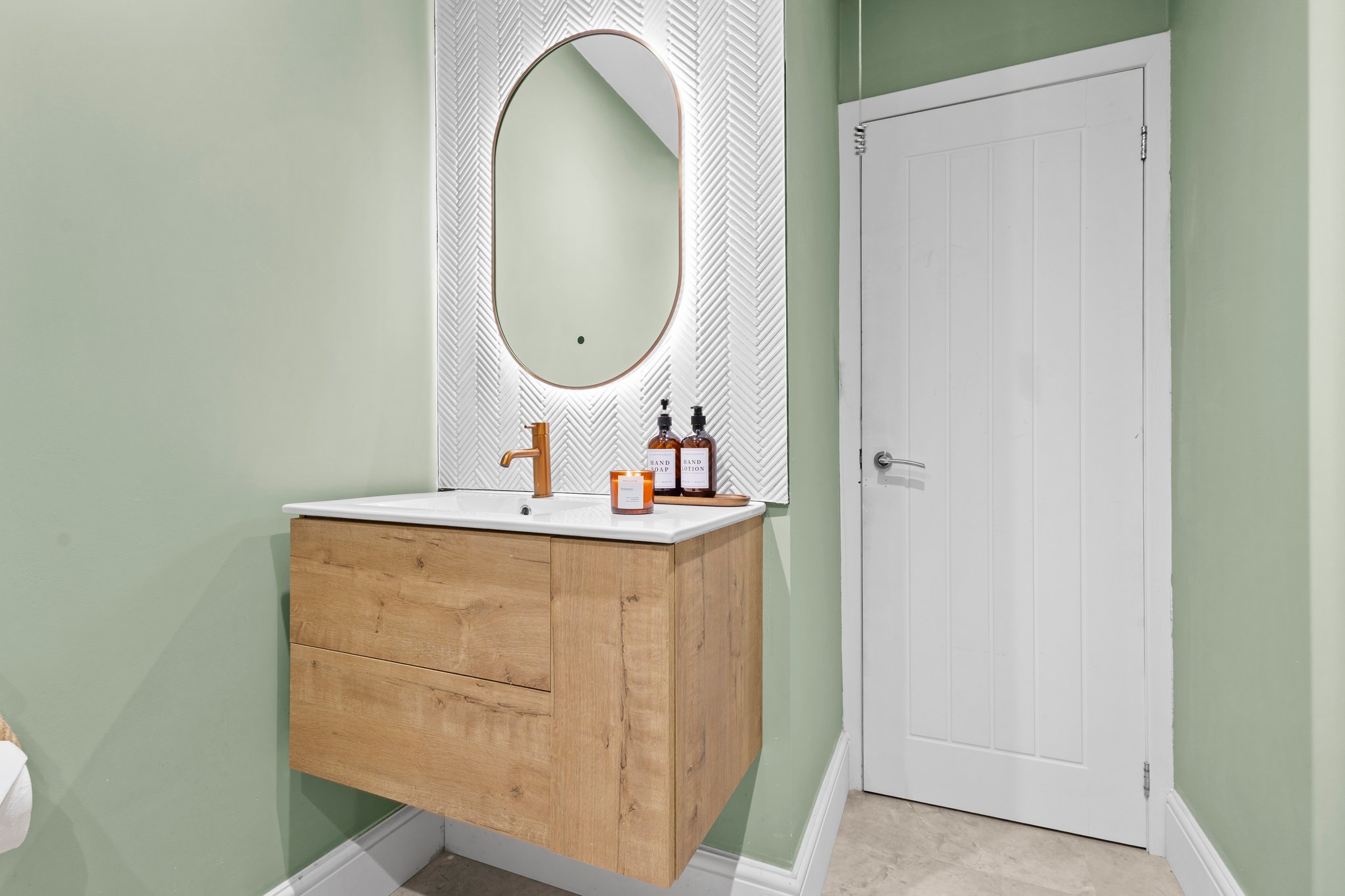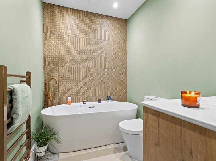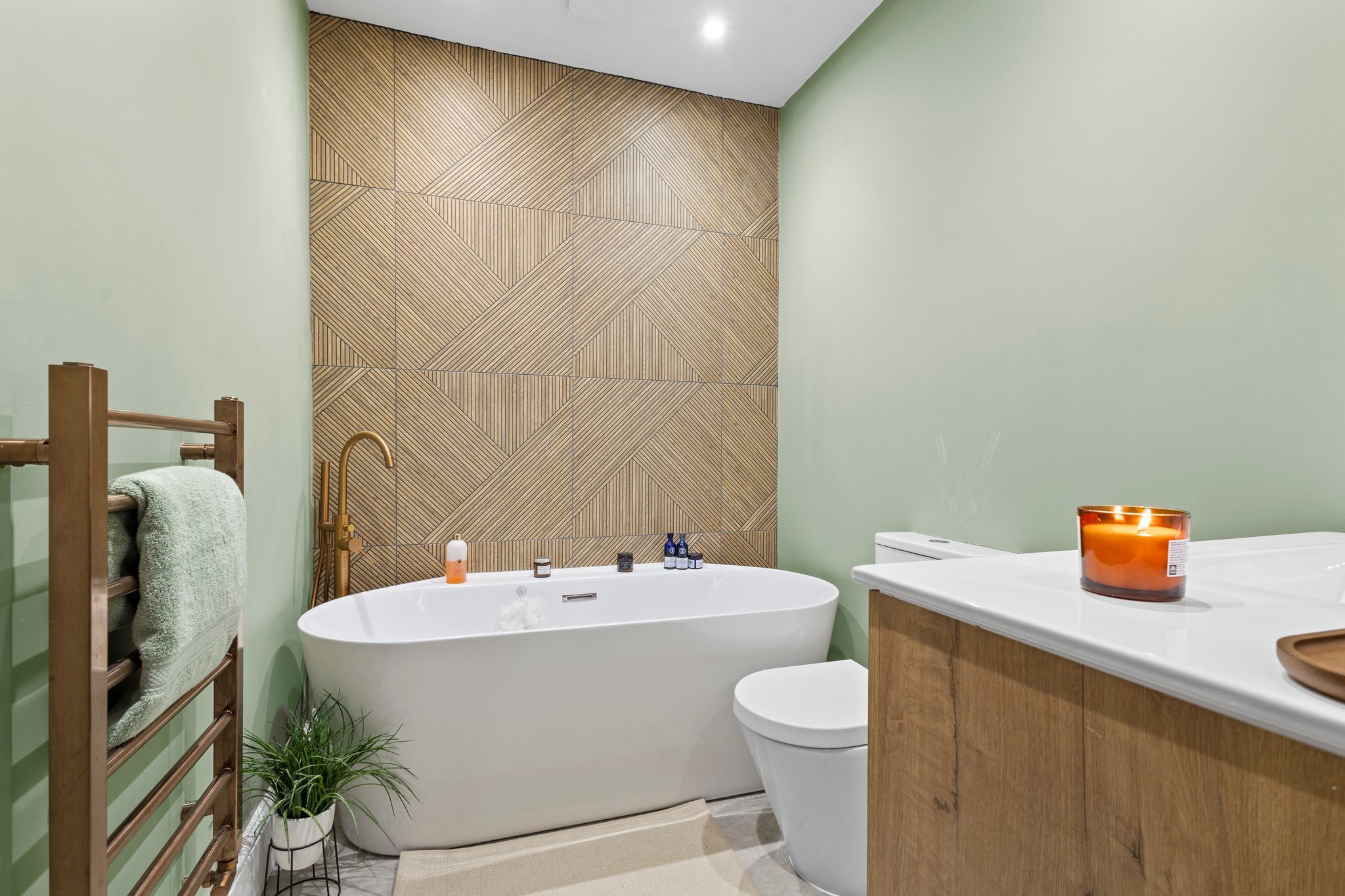 1.73m x 3.00m (5′ 8″ x 9′ 10″) Completing the accommodation is the stylish bathroom comprising of a wash hand basin with vanity storage, wc, free standing bath, LED mirror, heated towel rail, modern decor with a stylish tiled feature wall and gold finishings, ceiling spotlights and vinyl flooring.