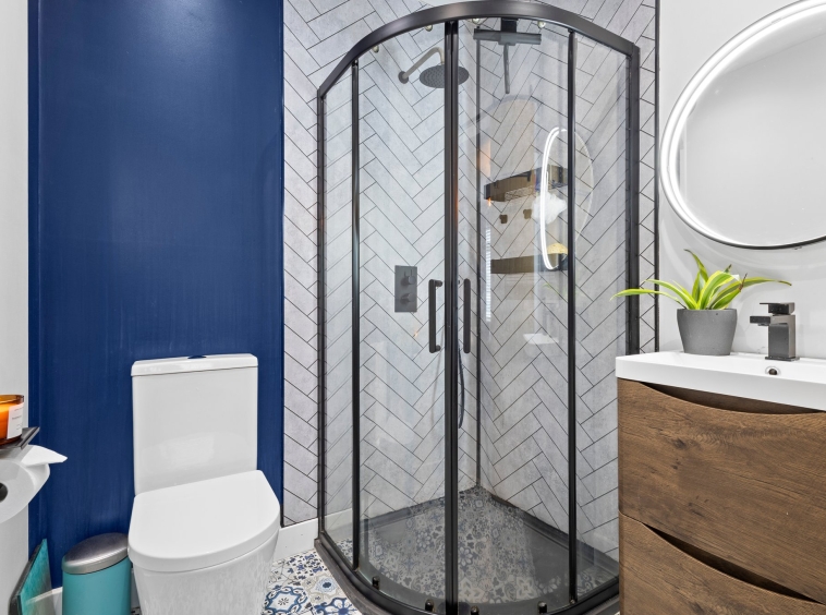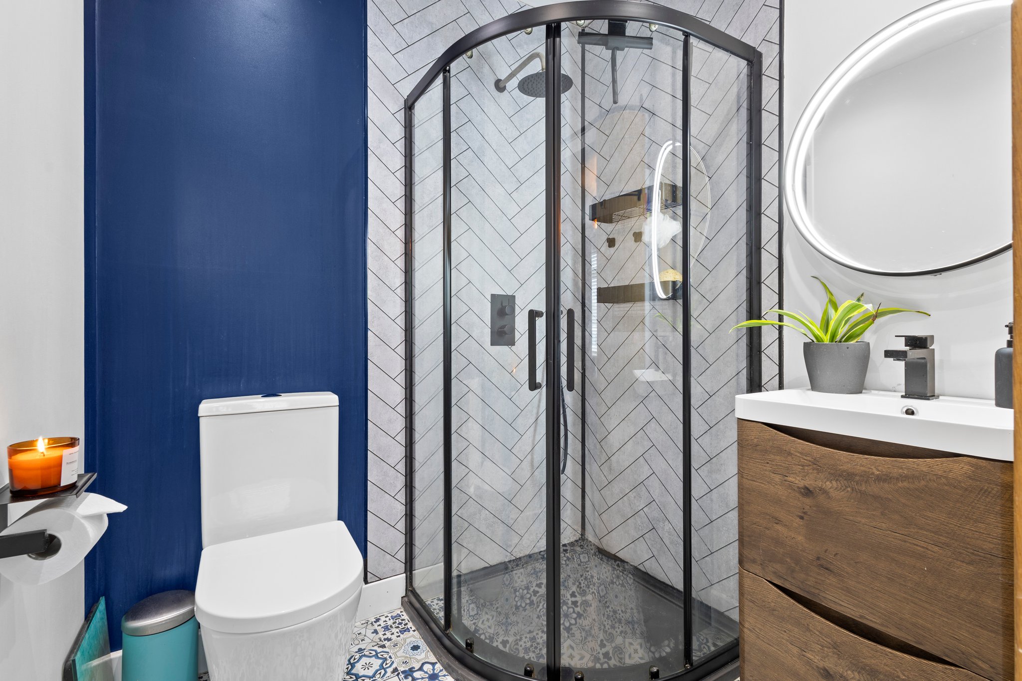 1.59m x 1.81m (5′ 3″ x 5′ 11″) Stylish en-suite comprising of a wash hand basin with vanity storage, wc, shower cubicle with mains shower, modern decor with a contemporary wet wall finish around the shower, ceiling spotlights and vinyl flooring.