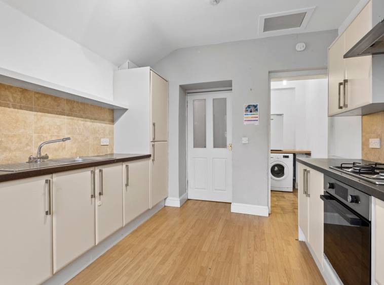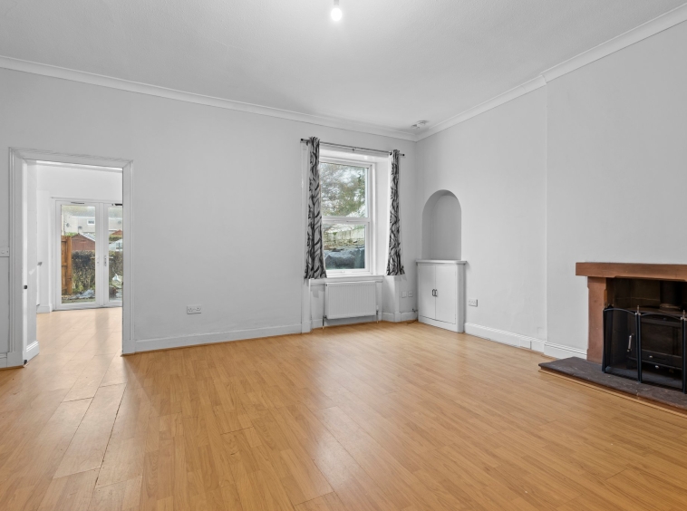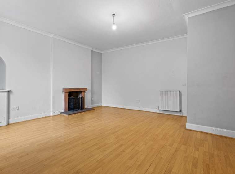 5.29m x 5.05m (17′ 4″ x 16′ 7″) Generous main apartment boasting neutral decor, ceiling coving, laminate flooring, feature fireplace with log burner, double glazed window to the rear, and gives access to the kitchen.