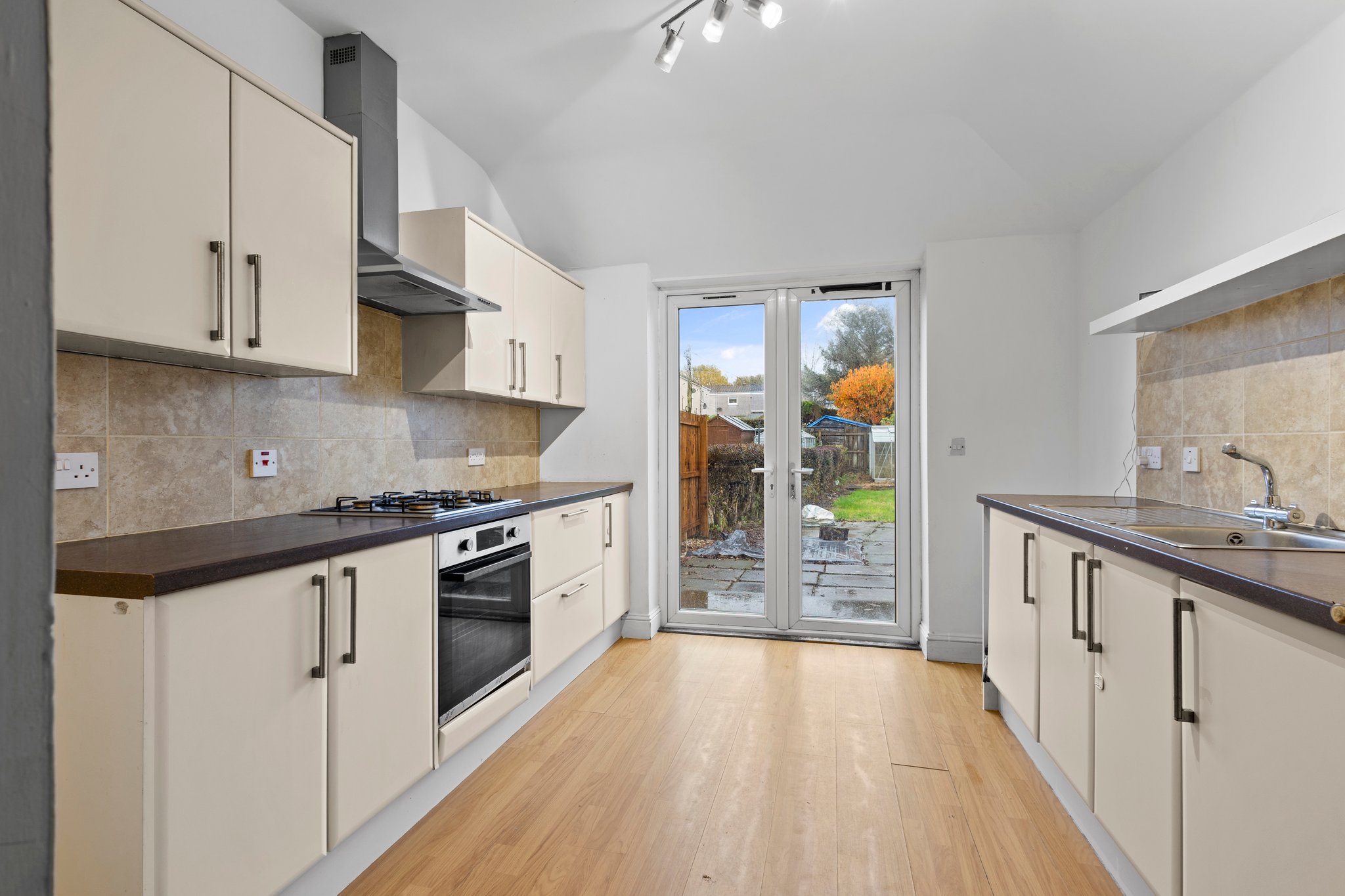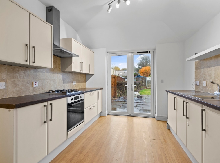 3.14m x 3.53m (10′ 4″ x 11′ 7″) Fully fitted kitchen offering an array of cream wall and base units, contrasting work surfaces, integrated gas hob and electric oven, oven hood, stainless steel sink and drainer, neutral decor, laminate flooring, double glazed patio doors leading to the rear garden and gives access to the utility room.