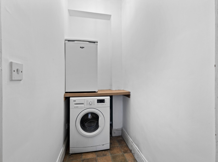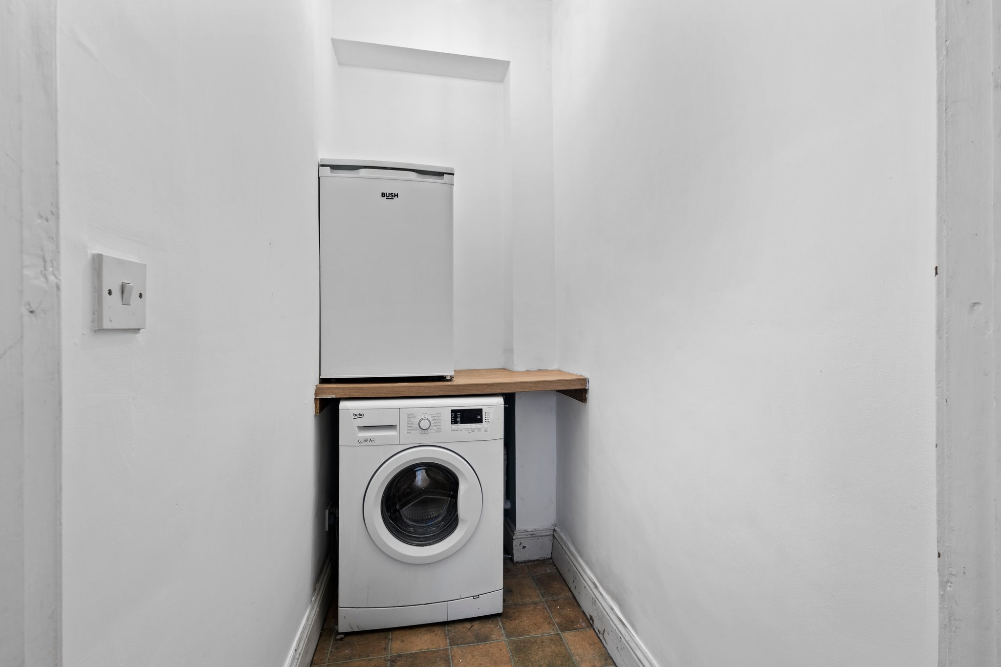 1.09m x 2.01m (3′ 7″ x 6′ 7″) Convenient utility space offering plumbing space for a washing machine and countertop space for a fridge, neutral decor and vinyl flooring.