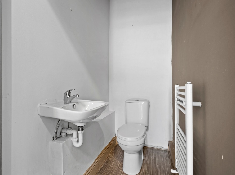 1.09m x 1.76m (3′ 7″ x 5′ 9″) WC located off of the downstairs hallway featuring WC, wash hand basin, heated towel rail and vinyl flooring.