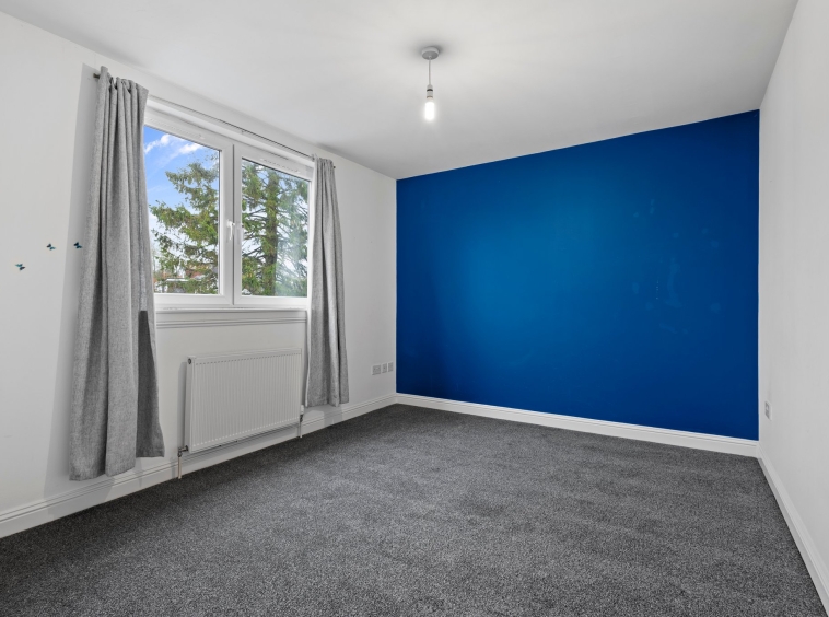 4.07m x 3.12m (13′ 4″ x 10′ 3″) Double bedroom featuring neutral decor with navy feature wall, fitted carpet and double glazed window to the rear.