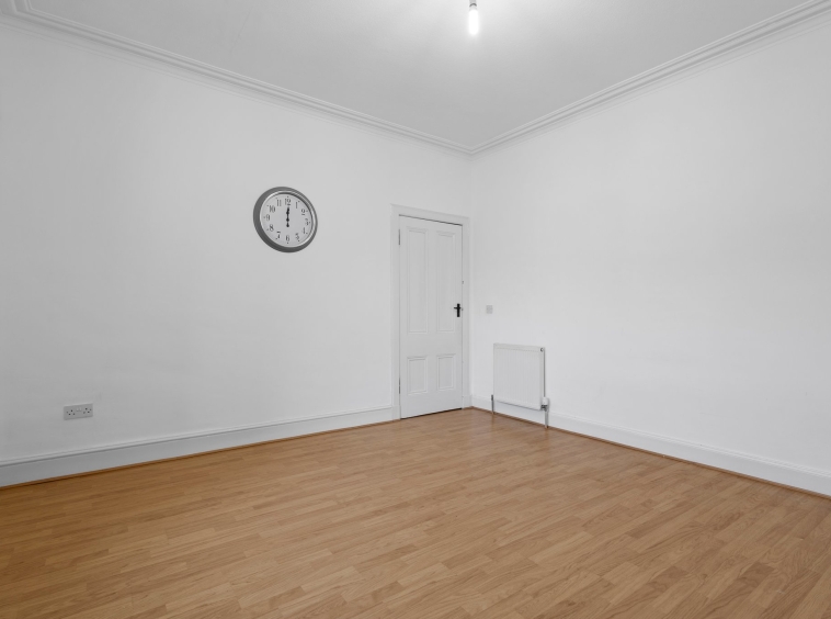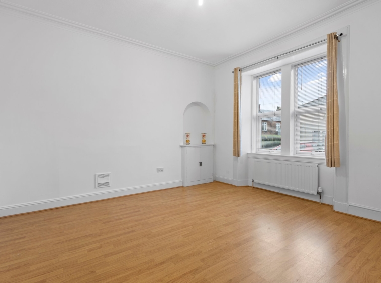 4.29m x 4.26m (14′ 1″ x 14′ 0″) Flexible living space on the ground floor featuring neutral decor, ceiling cornice, laminate flooring and double glazed window to the front.