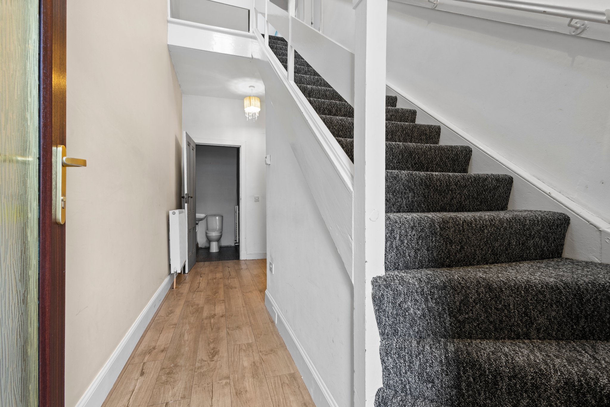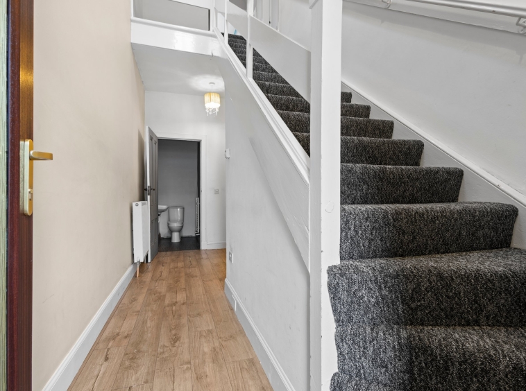 2.08m x 5.32m (6′ 10″ x 17′ 5″) Accessed by the outer opaque glazed wooden door in to the welcoming hallway featuring neutral decor, laminate flooring, carpeted stair case to the upper level, storage cupboard under stair and gives access to the livingroom, bedroom one and the WC.