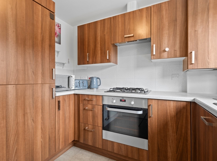 2.49m x 2.69m (8′ 2″ x 8′ 10″) Fully fitted kitchen complete with ample wall and base storage units, complimentary work surface, integrated oven, gas hob and hood, dish washer and fridge freezer, stainless steel sink and drainer, neutral decor, vinyl flooring and a double glazed window to the front.
