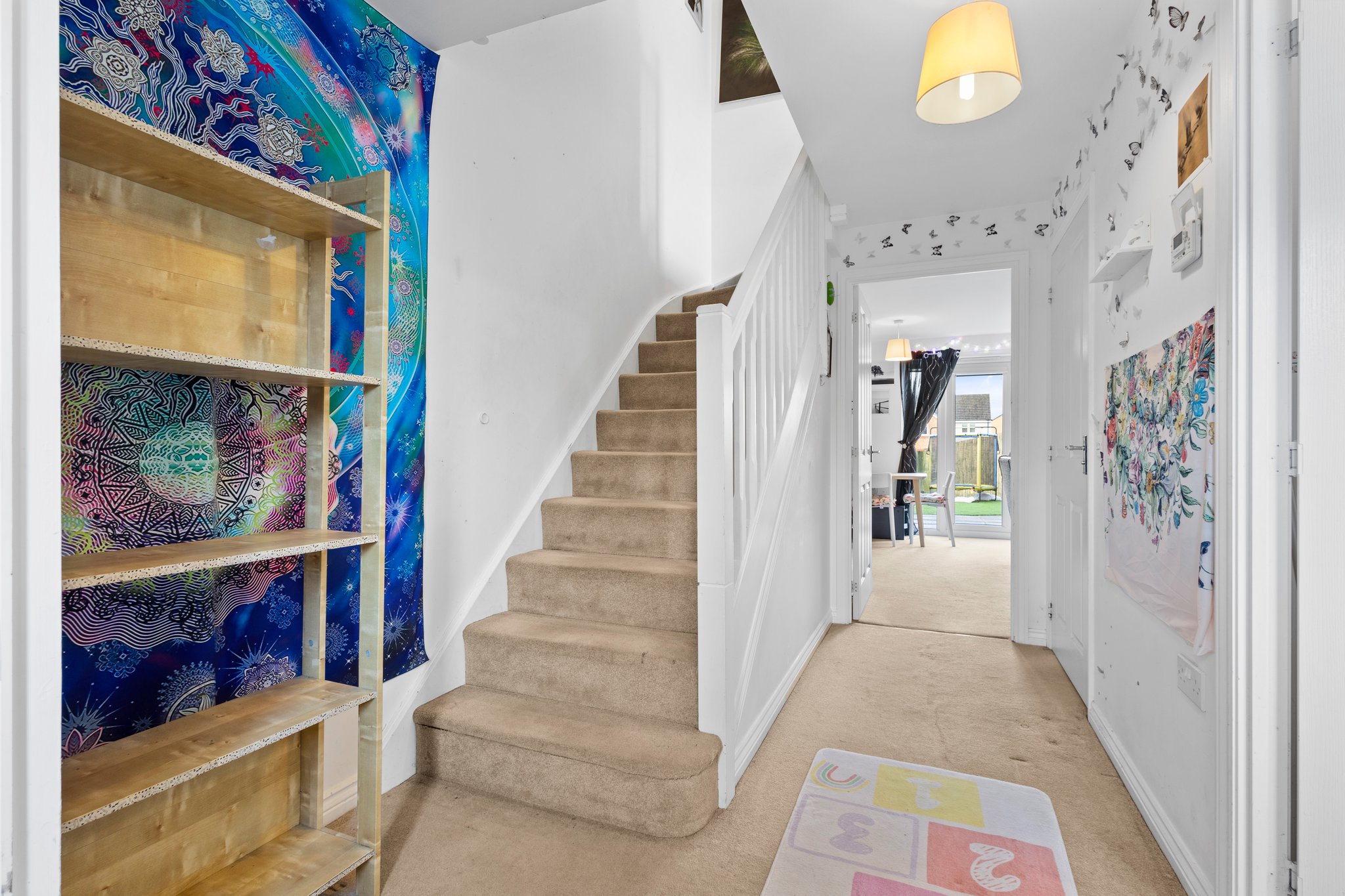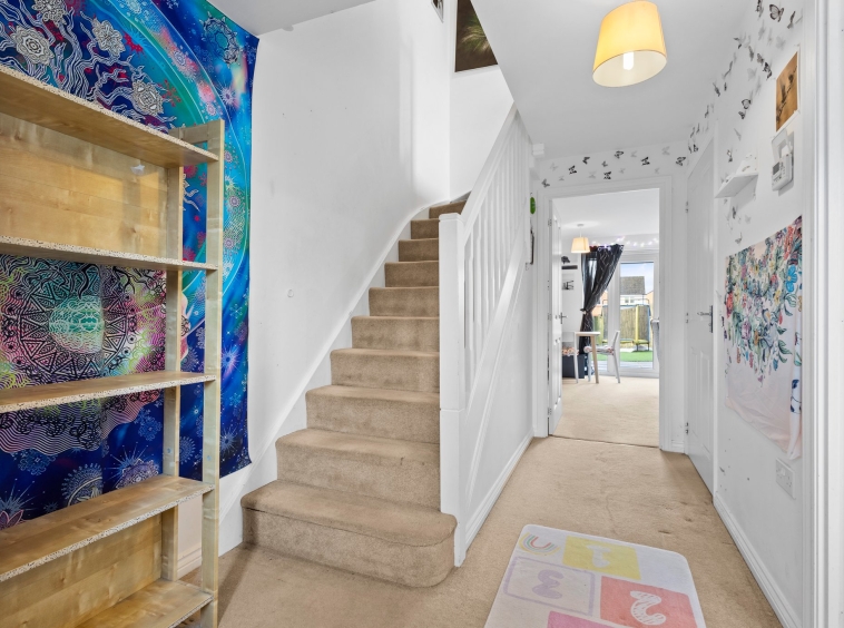 1.49m x 0.92m (4′ 11″ x 3′ 0″) Access is given to a welcoming entrance hallway boasting neutral decor, practical storage cupboard and fitted carpet. The hallway gives access to the lounge, kitchen, wc and a carpeted staircase leads to the upper level.