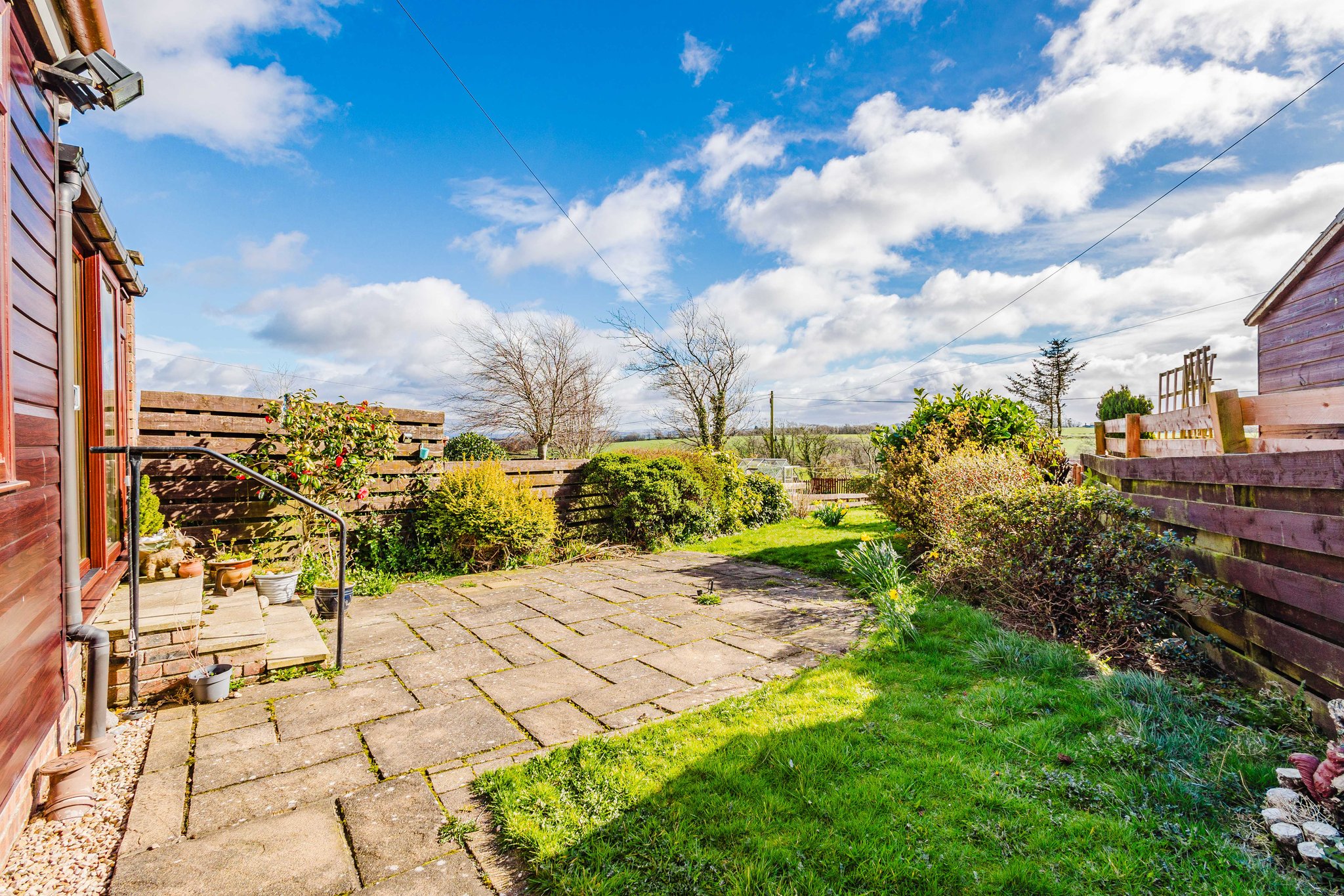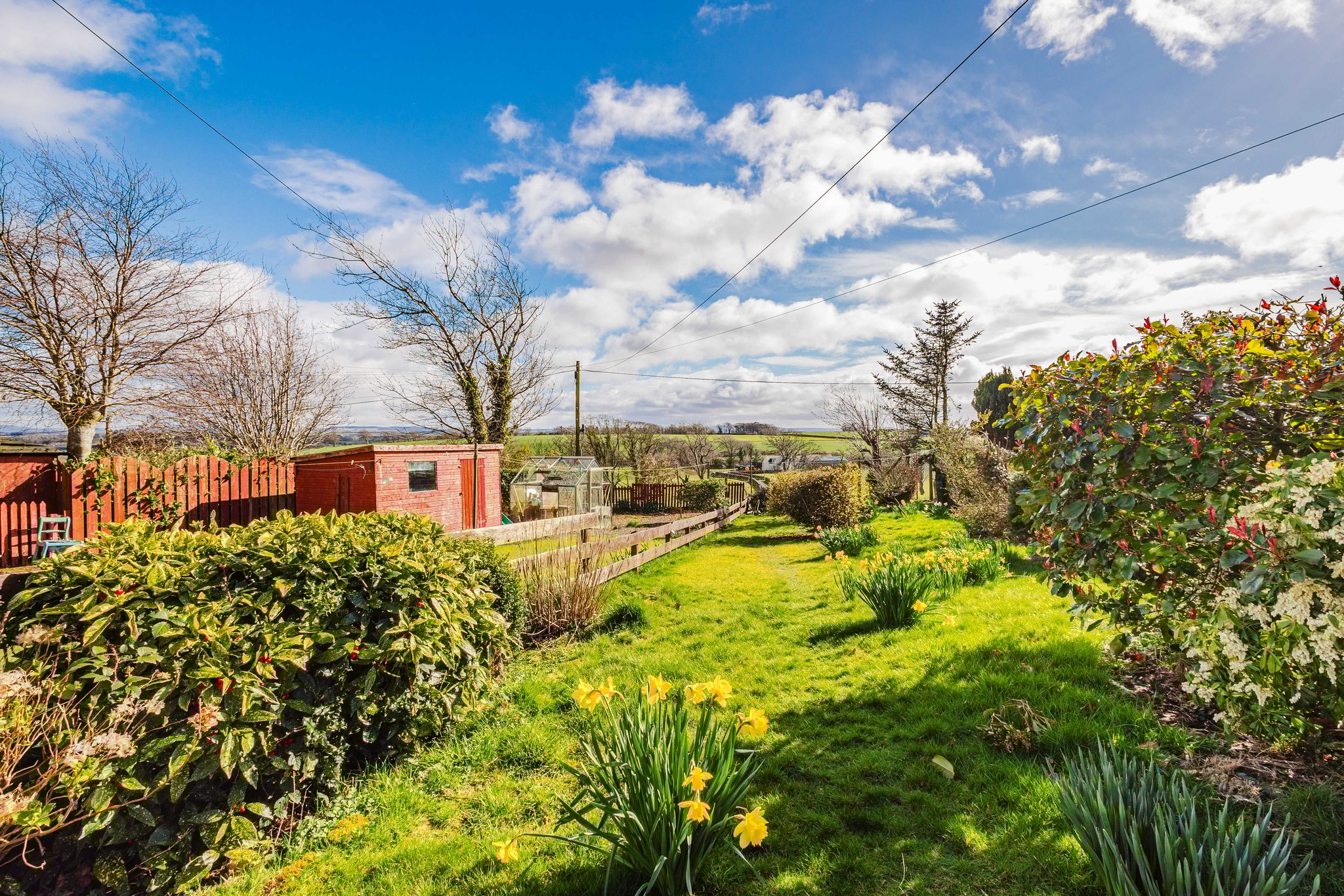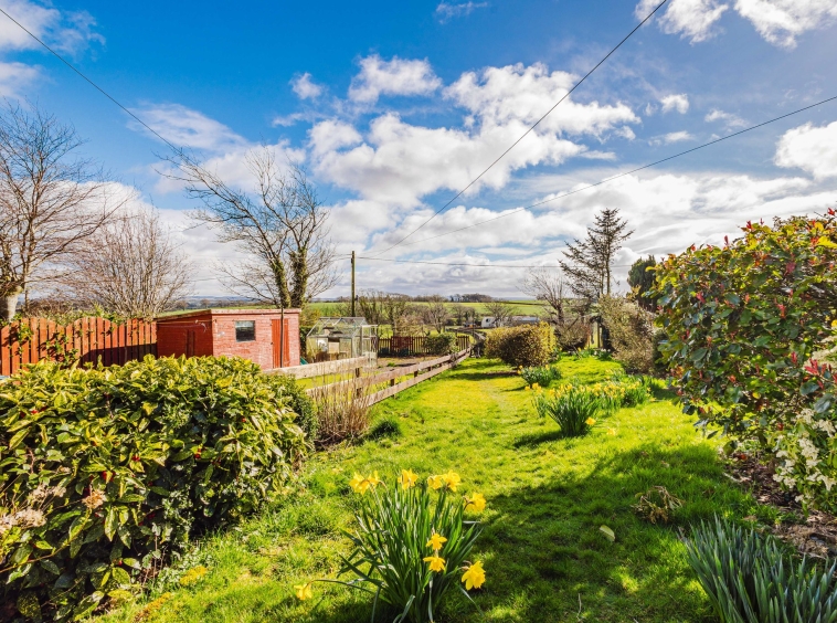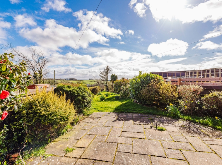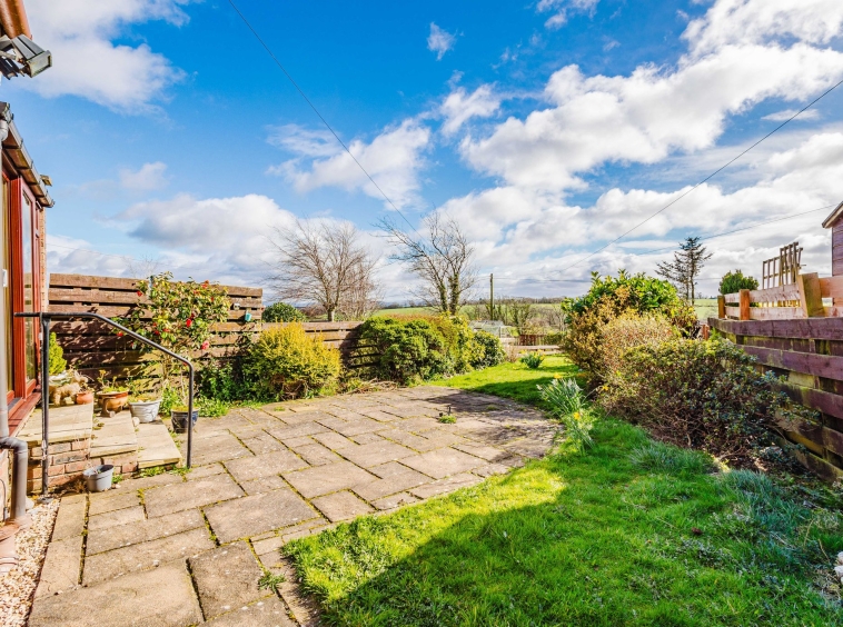 To the rear, the garden includes a large lawn, established planting, and a paved patio area—ideal for outdoor dining or simply relaxing while taking in the open countryside views.